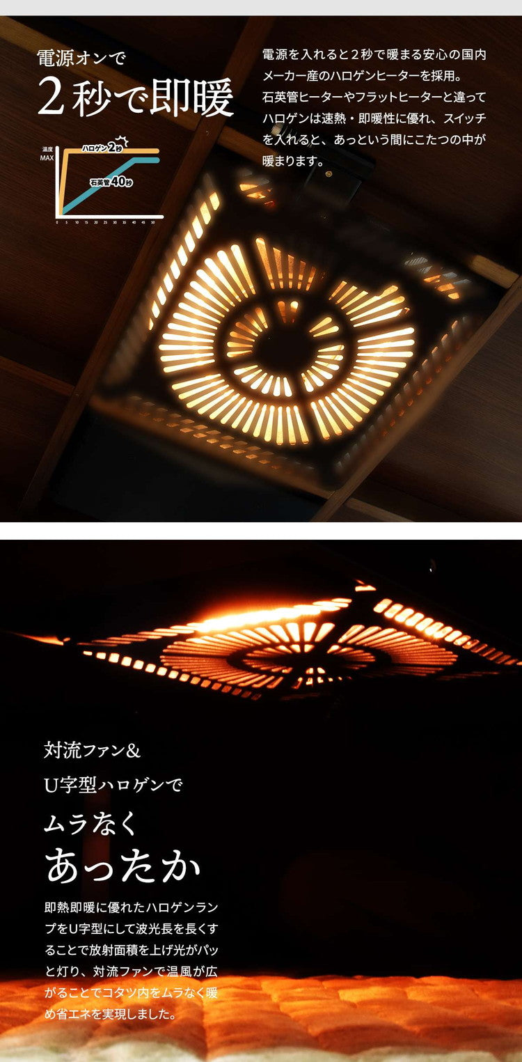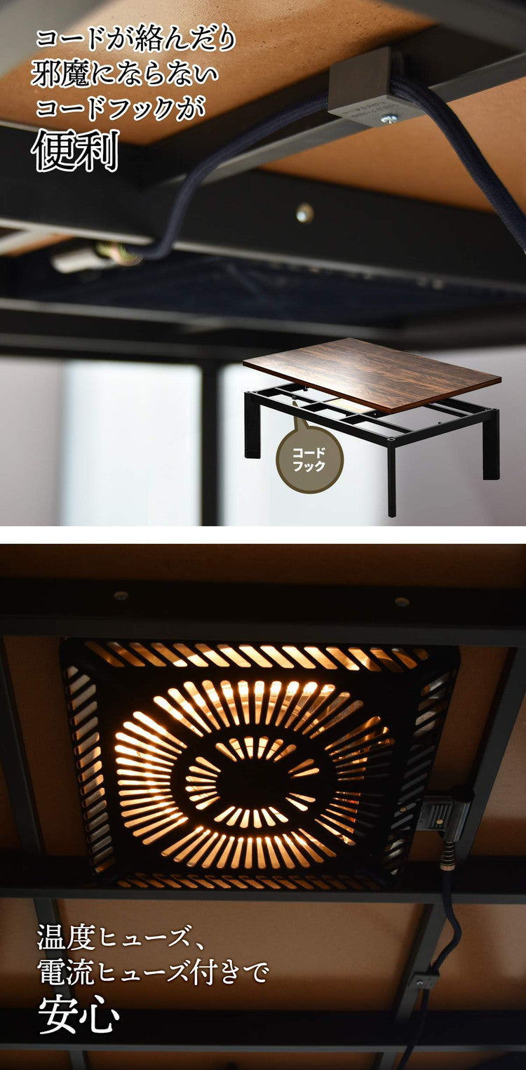 素材:【天板】プリント化粧合板(UV塗装) 【脚フレーム】天然木(ウレタン塗装)【ヒーター】U字型ハロゲンヒーター「メーカー型番:MHU-601E(D)」 /