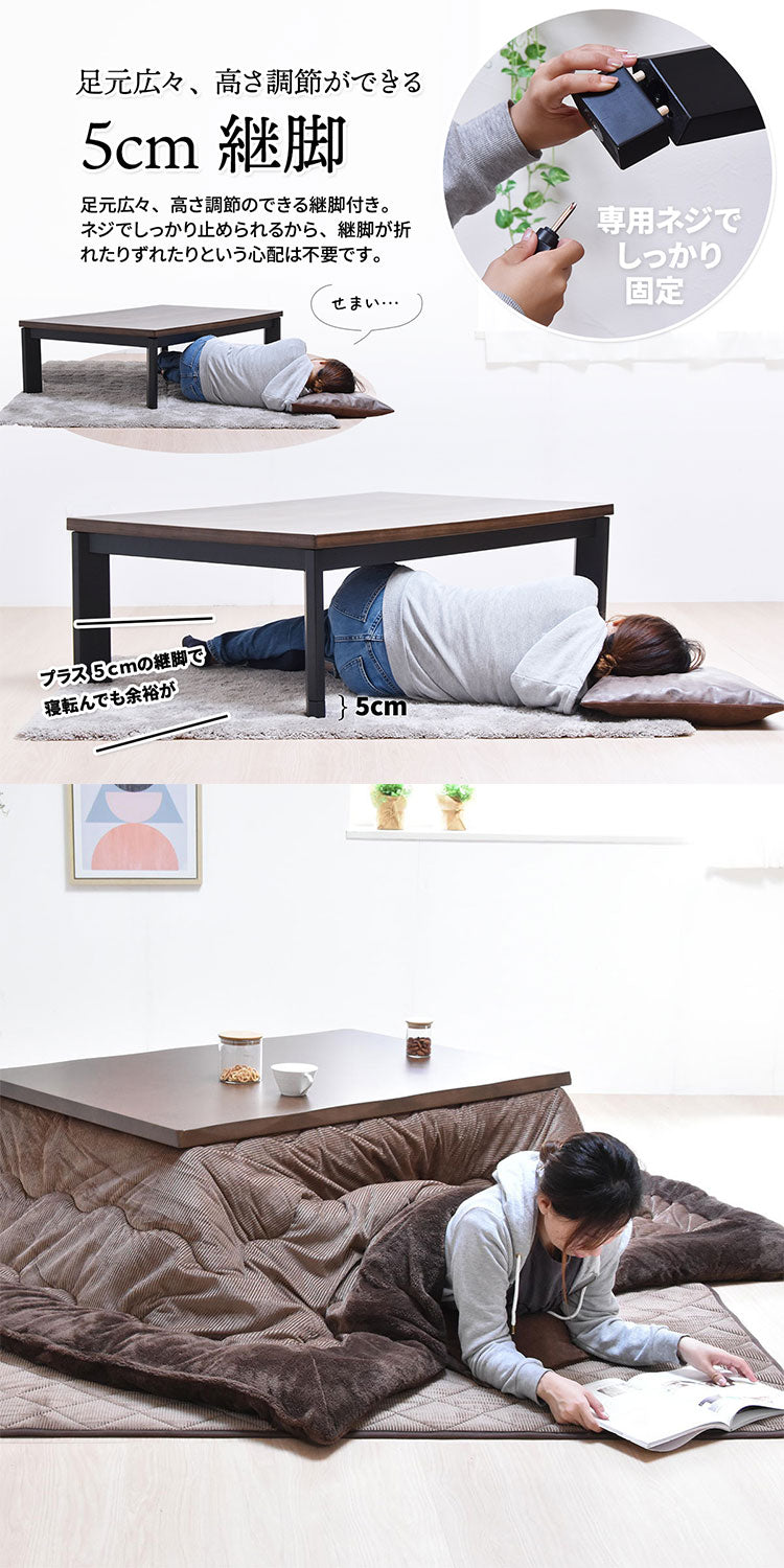 人気の高いウォールナット柄シートを使用し、シンプルで飽きの来ないデザインのコタツ兼ローテーブルと、掛布団、敷布団の合計【3点セット】です。日本でも人気の高い世界三大銘木【ウォールナット】柄シートを使用しており、おしゃれで落ち着いた木目なので、色んなお部屋にマッチします。高さは36cmと41cmの2段階調整ができ、お好みの高さでご使用いただけます。ヒーター部分は安心な日本メーカーのメトロ電気工業の製品が使用されており、手元で温度調節ができるコントローラー付いていて便利です。コタツを使わない季節では、布団を外せば普通のローテーブルとしても使えるので、一年通して使えるコタツ兼ローテーブルとして人気です。天板塗装には耐久性の高いUV塗装を施しているので、高品質なので長くお使い頂けます。掛・敷布団は、グレーとブラウンを基調とした生地で落ち着きがあり、掛布団は中綿がしっかり詰まってボリュームのある布団なので暖かく高級感があります。こたつはエアコンと比較すると、約3分1の電気代で済むと言われており昨今の高騰する電気代の節約にも優れています。