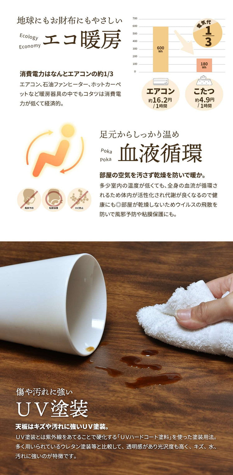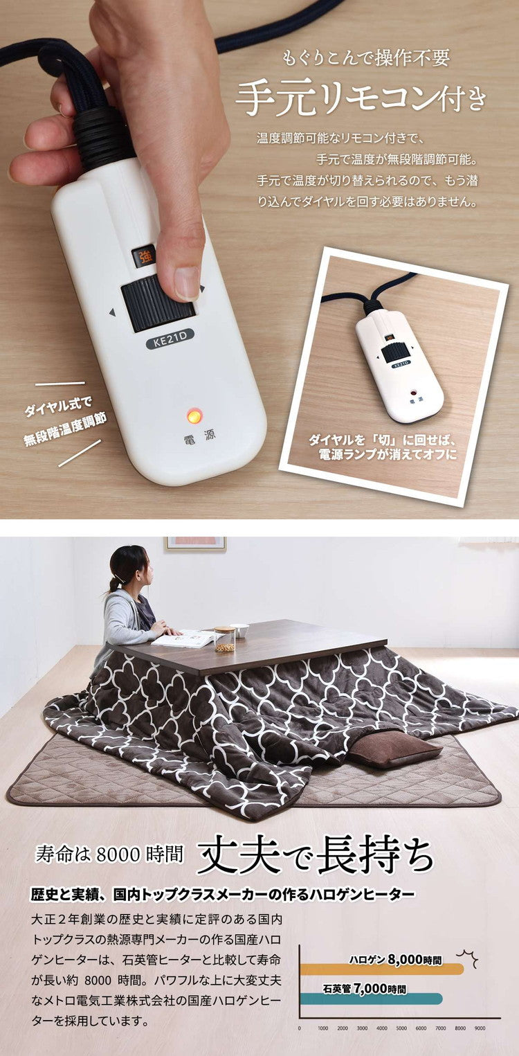 素材:【天板】プリント化粧合板(UV塗装) 【脚フレーム】天然木(ウレタン塗装)【ヒーター】U字型ハロゲンヒーター「メーカー型番:MHU-601E(D)」 /