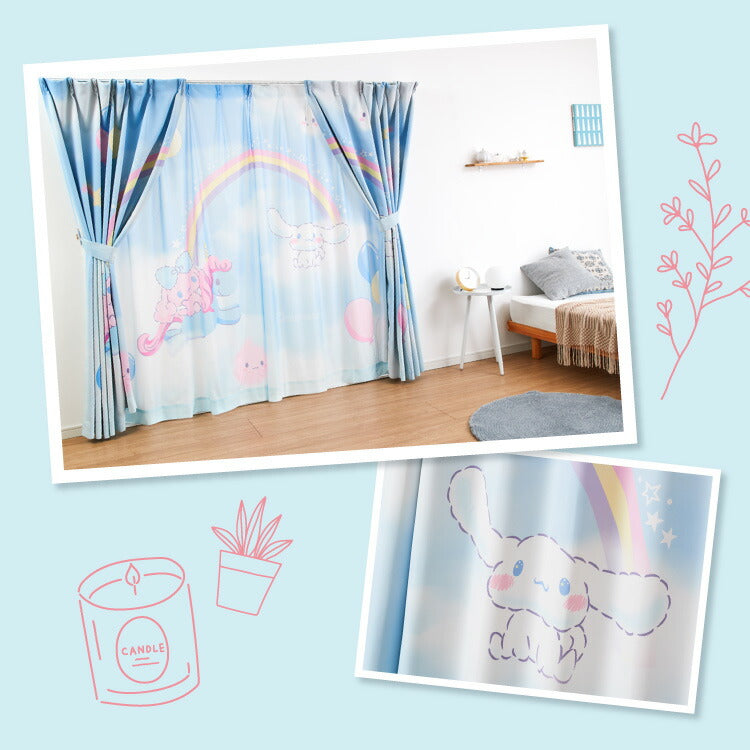 シナモン絵羽遮光カーテン 2枚組 100×150cm ドレープカーテン 遮光 洗える 洗濯 カーテン フック タッセル付き おしゃれ かわいい サンリオ シナモロール ポロン コルネ(代引不可)