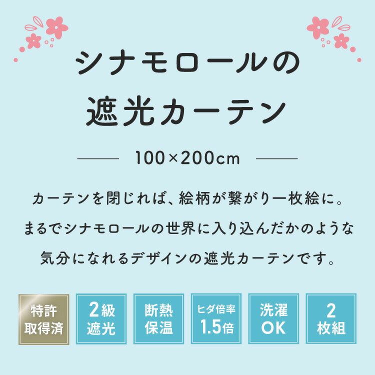 シナモン絵羽遮光カーテン 2枚組 100×200cm ドレープカーテン 遮光 洗える 洗濯 カーテン フック タッセル付き おしゃれ かわいい サンリオ シナモロール ポロン コルネ(代引不可)