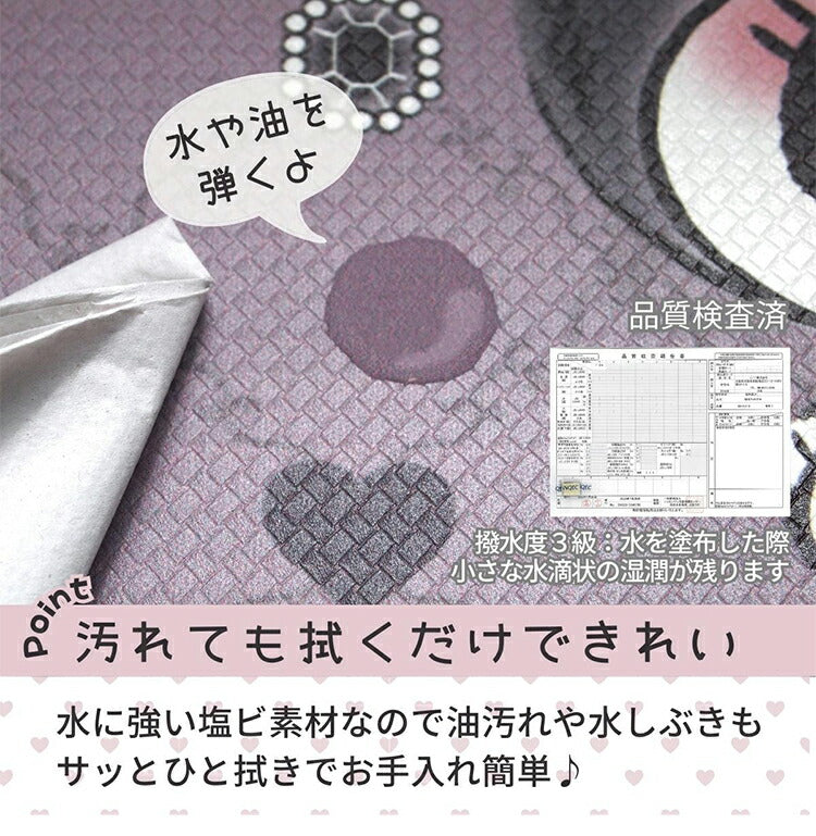 クロミちゃんデザインのPVCキッチンマットが登場!塩ビ素材を使用しているので、抗菌性、防炎性に優れているだけでなく、撥水性があり、水を弾いてくれ、さっと拭くだけでお手入れも簡単!