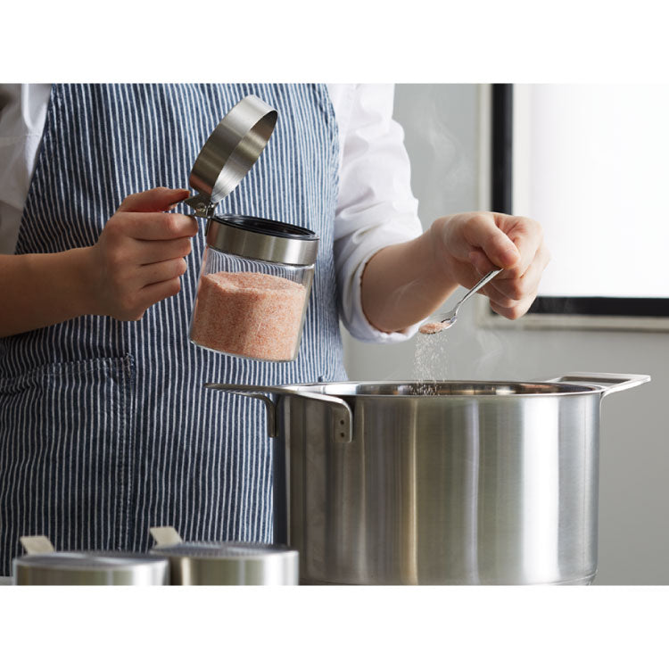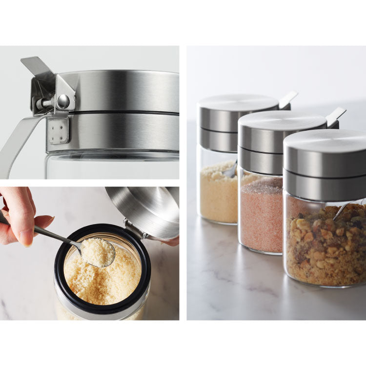 片手でフタの開閉がしやすく、フタの口径が広い為、付属のスプーンですくい易い調味料ポット。