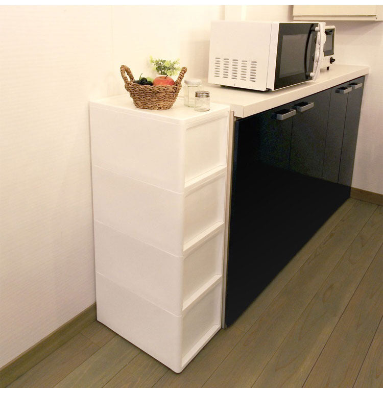 ・オールホワイトの隙間収納チェスト。中身が透けないのでスッキリして見えます。