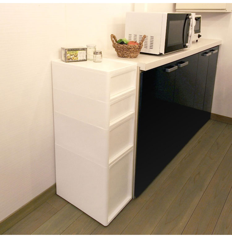 ・オールホワイトの隙間収納チェスト。中身が透けないのでスッキリして見えます。