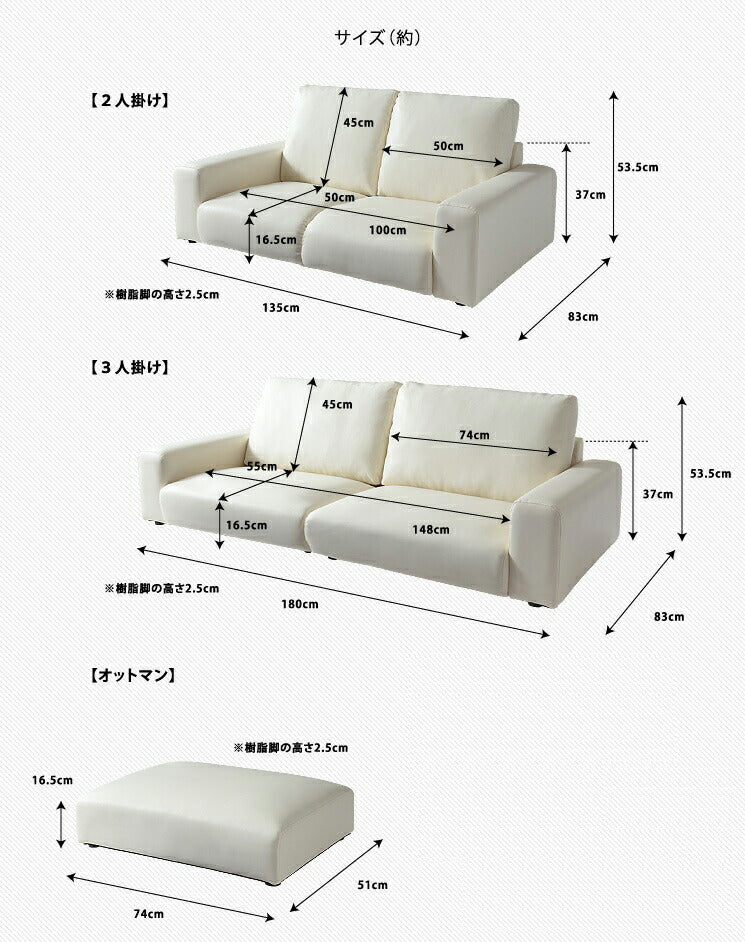 2人掛け:(約)幅135×奥行83×高さ53.5(座面高16.5)cm
