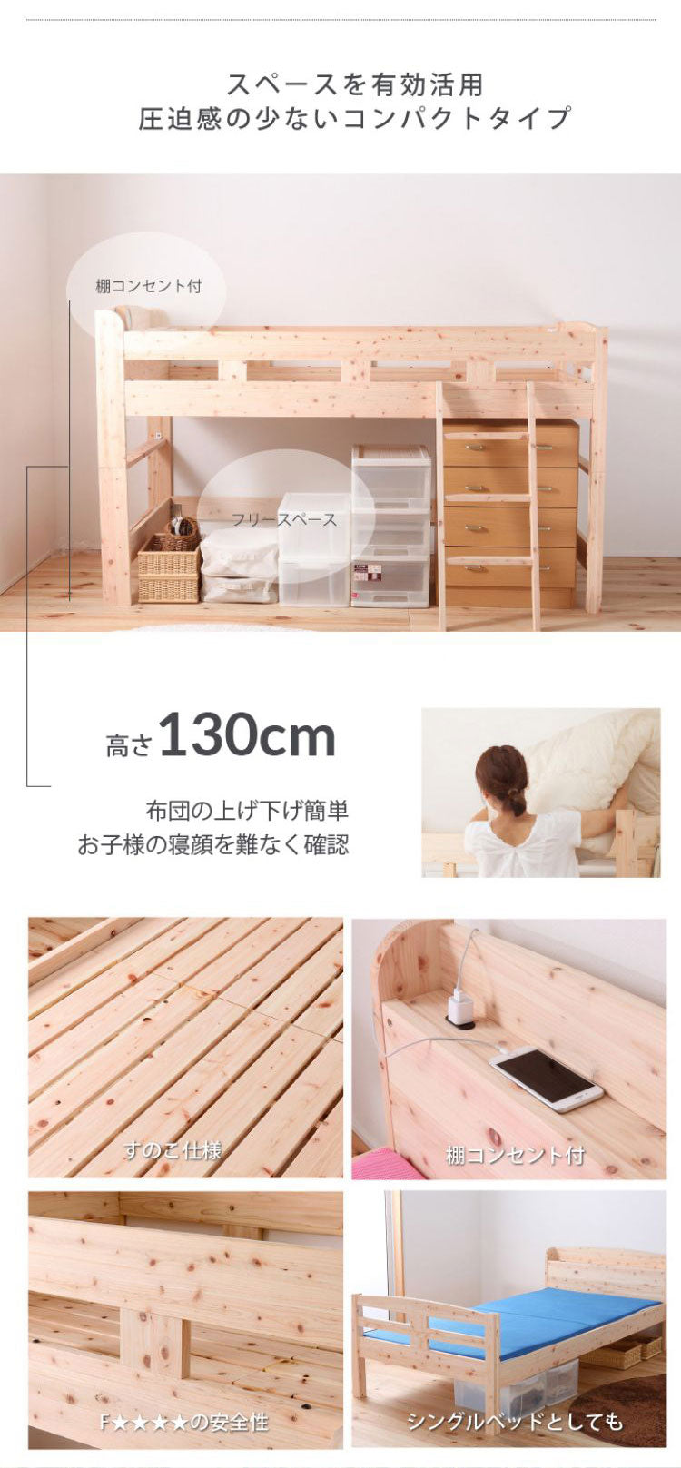 国産のヒノキ材を贅沢に使用したロフトベッド。床下を有効に活用できます。1口コンセント1200W