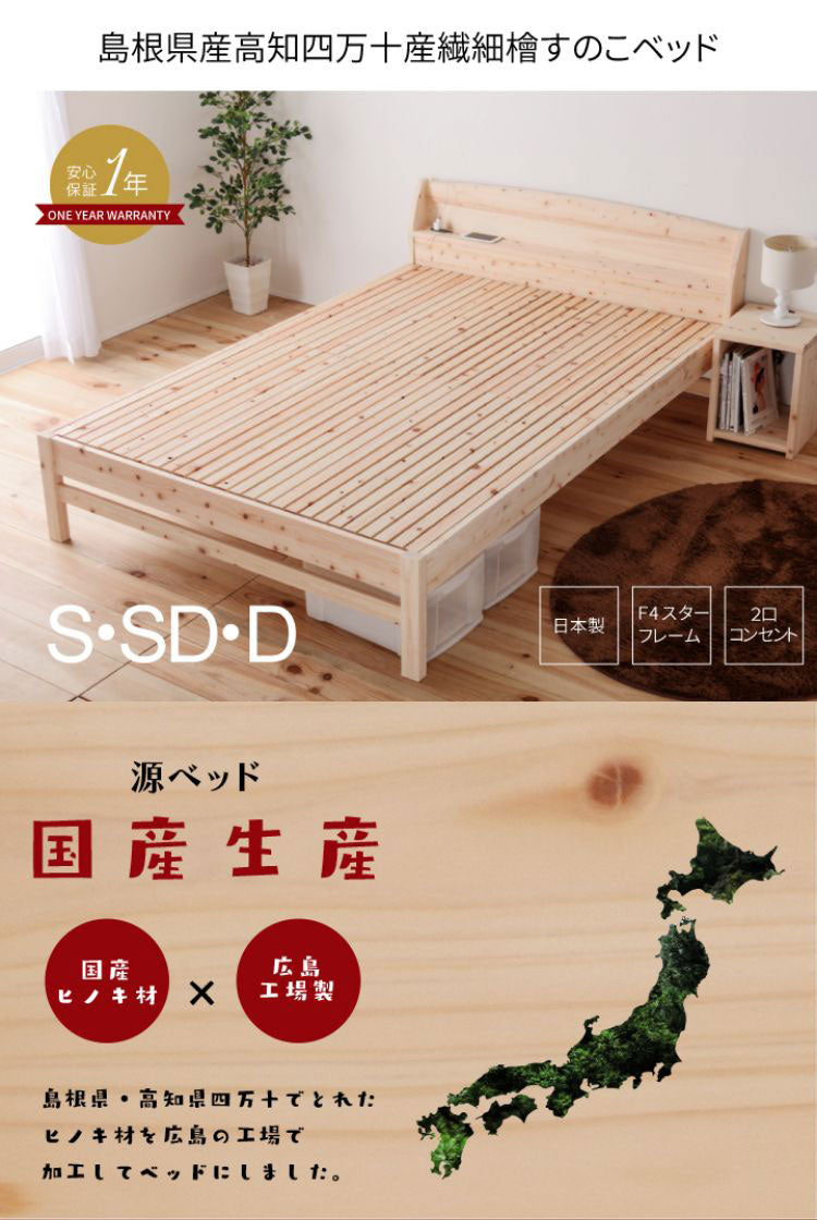 国産ヒノキを贅沢に使ったベッド。高さ4段階調整可能。便利な棚コンセント付き。2口コンセント1500W