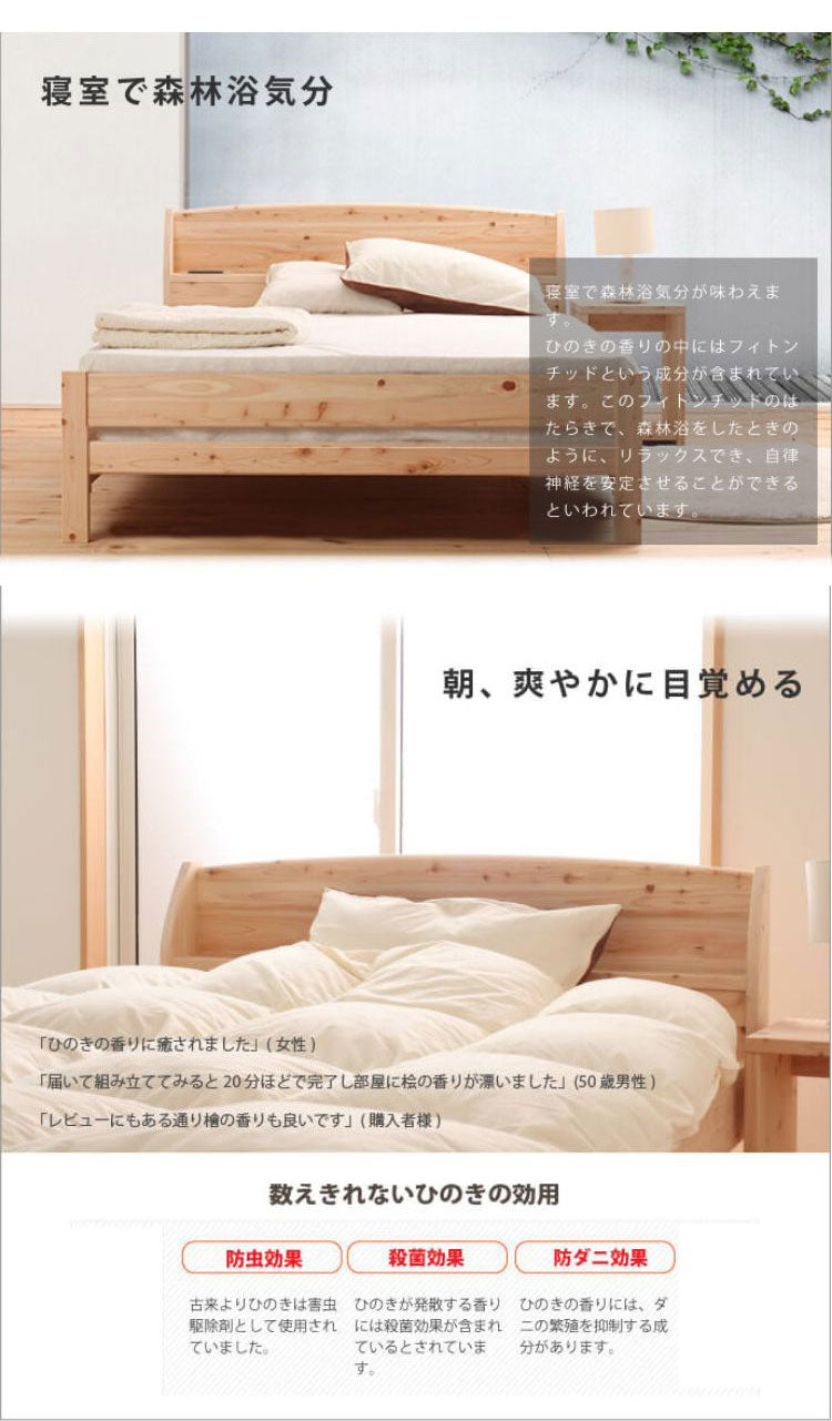 国産ヒノキを贅沢に使ったベッド。高さ4段階調整可能。便利な棚コンセント付き。2口コンセント1500W