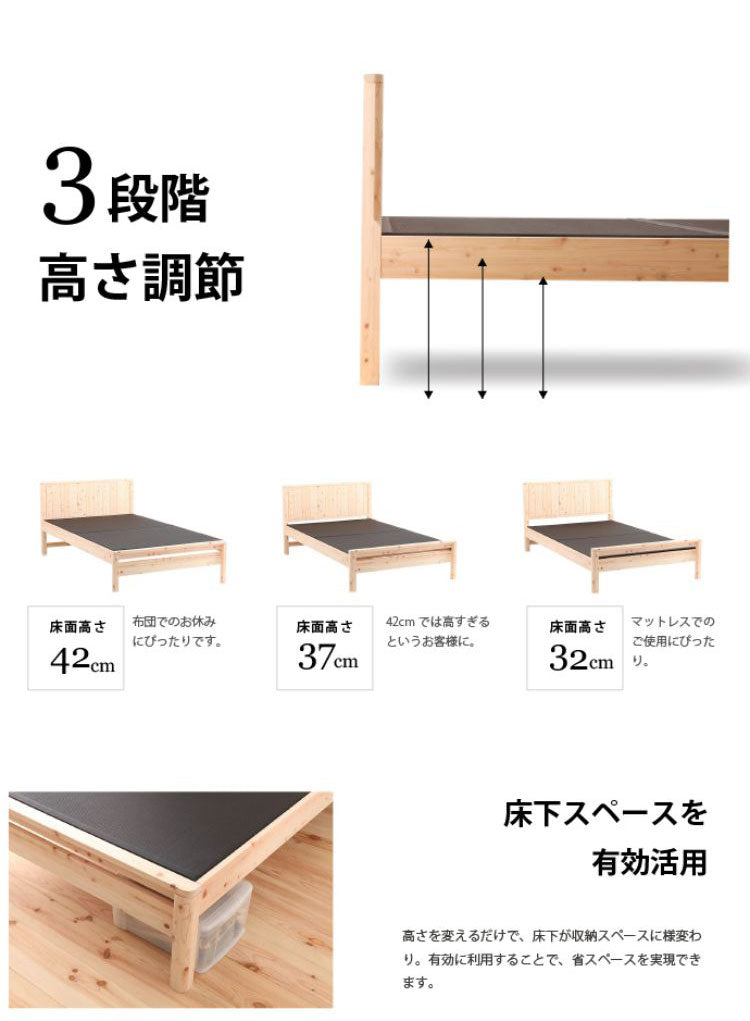 国産ヒノキを贅沢に使ったベッド。高さ3段階調整可能。ピッタリ並べて使用可能です。国産の黒畳付きタイプです。