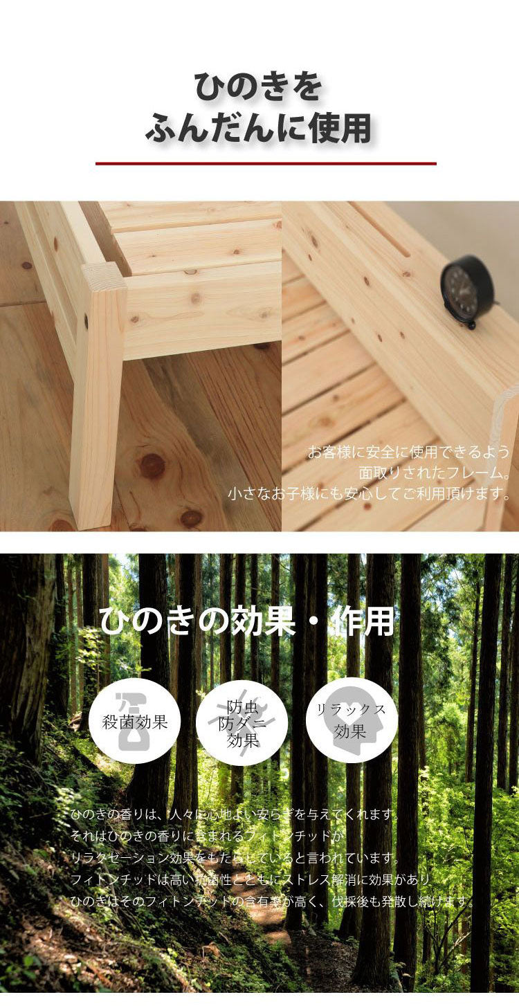 天然木ヒノキ、マットレス:ポリエステル100% ウレタン ポケットコイル