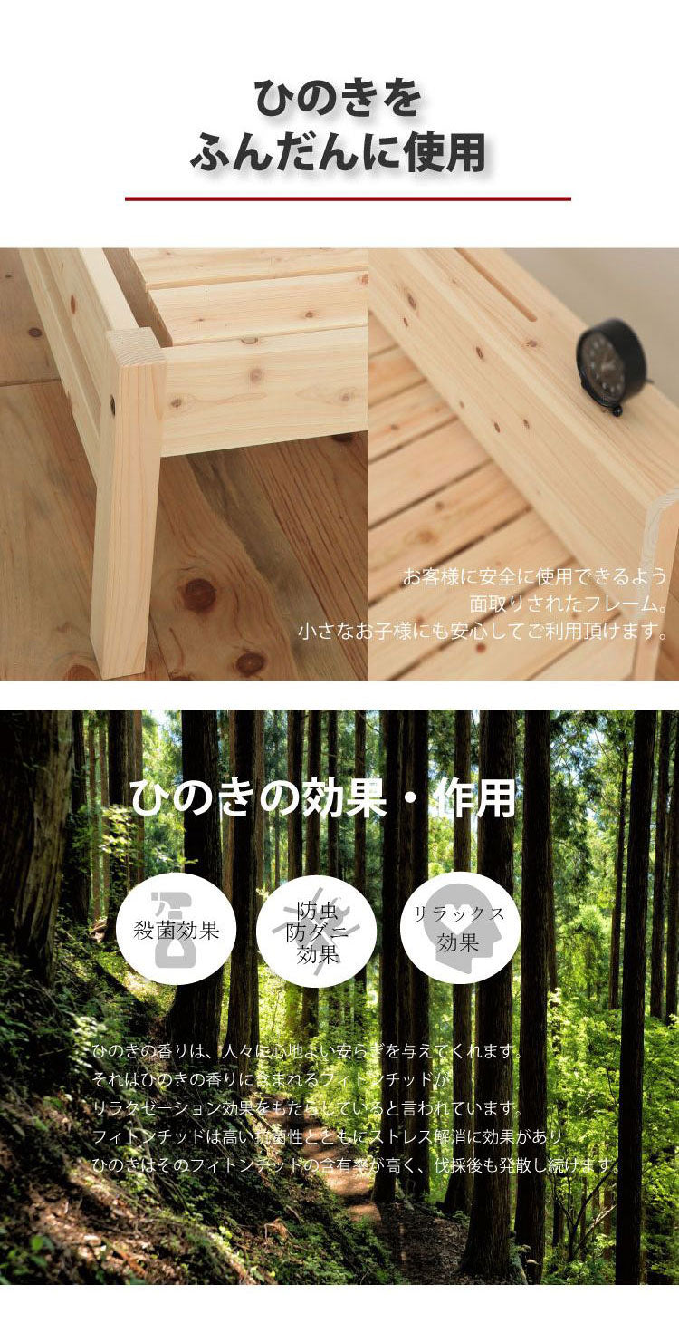 天然木ヒノキ、マットレス:ポリエステル100% ウレタン ポケットコイル