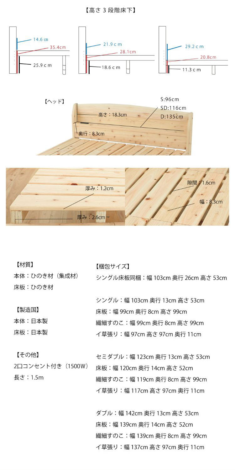 便利な棚コンセント付きのヒノキベッド。佐川急便で配送可能。2口コンセント付き。1500W