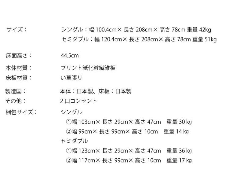 イグサ床板の大量収納ベッド。棚コンセント付き。2口1500W