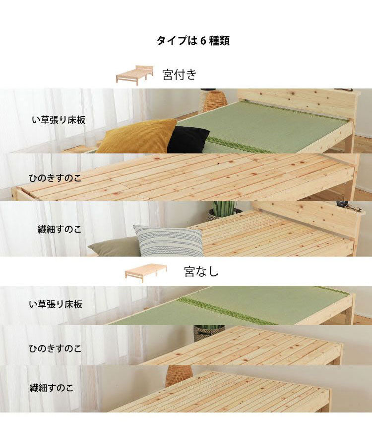 国産のヒノキ材を贅沢に使用したスノコベッド。便利な棚コンセント付き。1口1200W。