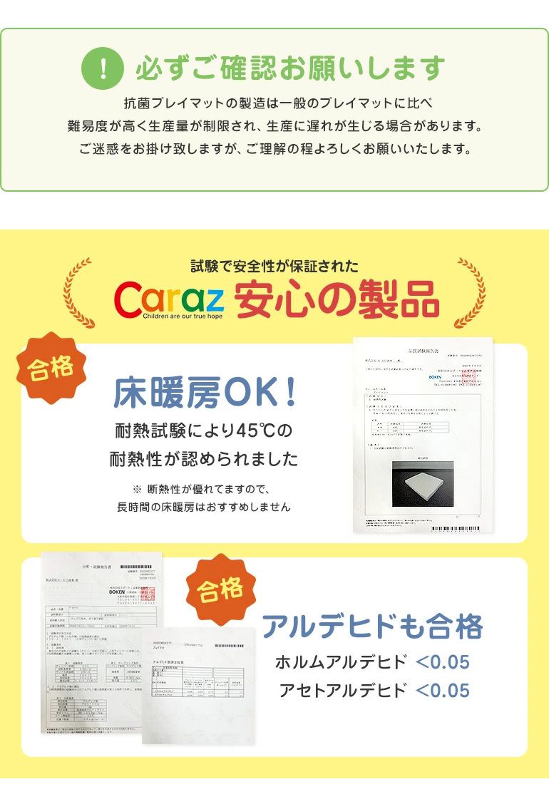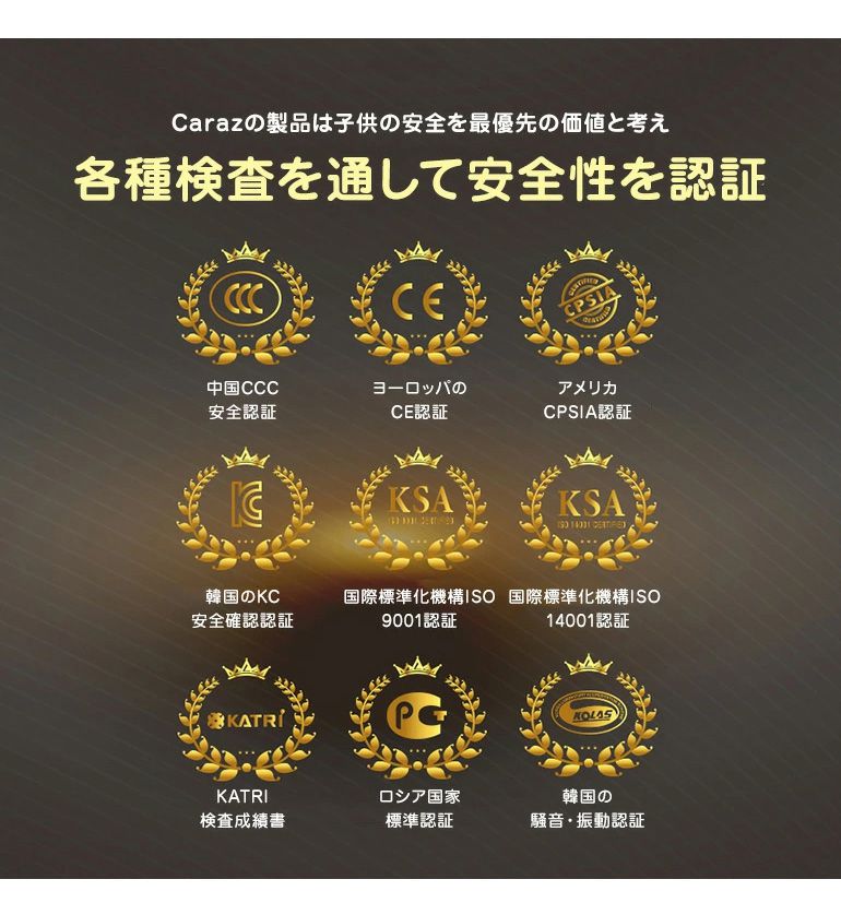 ISO9001認証、ISO14001認証、IC認証、ヨーロッパのCE認証、騒音・振動認証、アメリカCPSIA認証、KC認証、ロシア国家標準認証、Well-being認証など様々な安全テストに通過