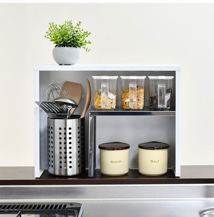 調味料やキッチンツールの収納だけでなく、背面が付いているため手元隠しにもなるよう設計されています。
