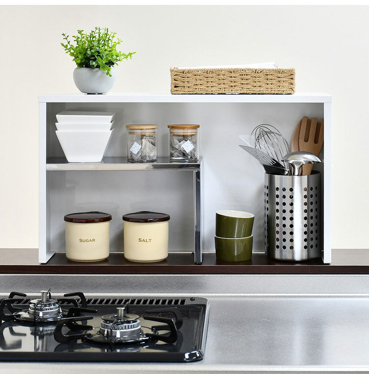 調味料やキッチンツールの収納だけでなく、背面が付いているため手元隠しにもなるよう設計されています。