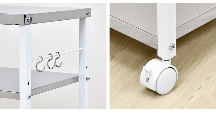 使い勝手の幅が広がるキャスター付き。必要な時だけ移動したり、固定をして作業したりできます。※移動の際には作業台をしまった状態で動かしてください。