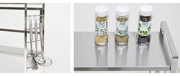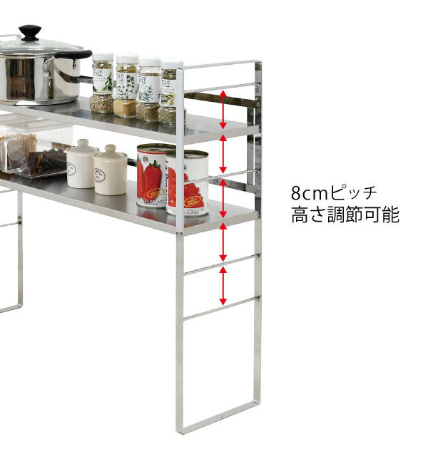 棚板は高さ調節が8cmピッチで変えることができ、調味料などの高さに合わせて使うことができます。
