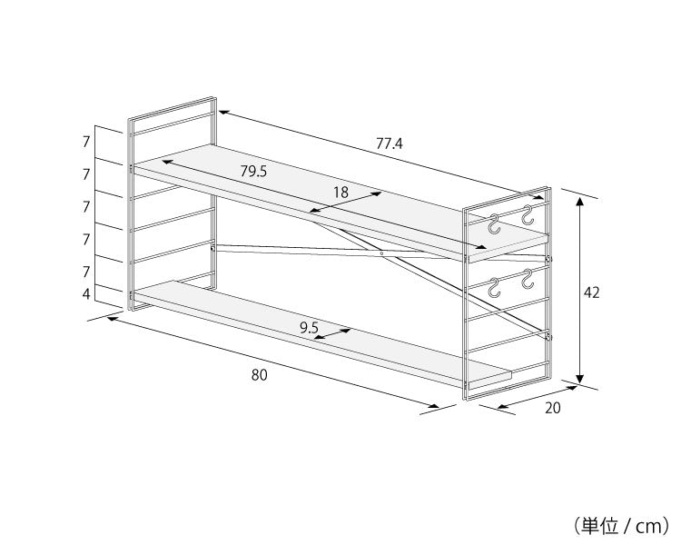棚は7cmピッチで調整が可能です。ビス止めではないため簡単に取り外しができ高さを変えることができます。