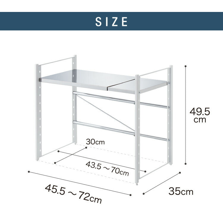 日本製 燕三条 伸縮レンジ上ラック 1段 ステンレス棚 キッチン家電をまとめて収納! 幅45.5~72 高さ調節 キッチンラック レンジ上 伸縮 棚 電子レンジ 家電上ラック カウンター上収納 頑丈 おしゃれ(代引不可)