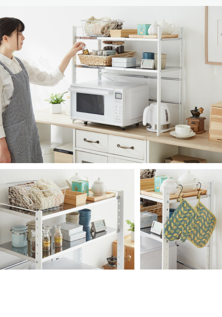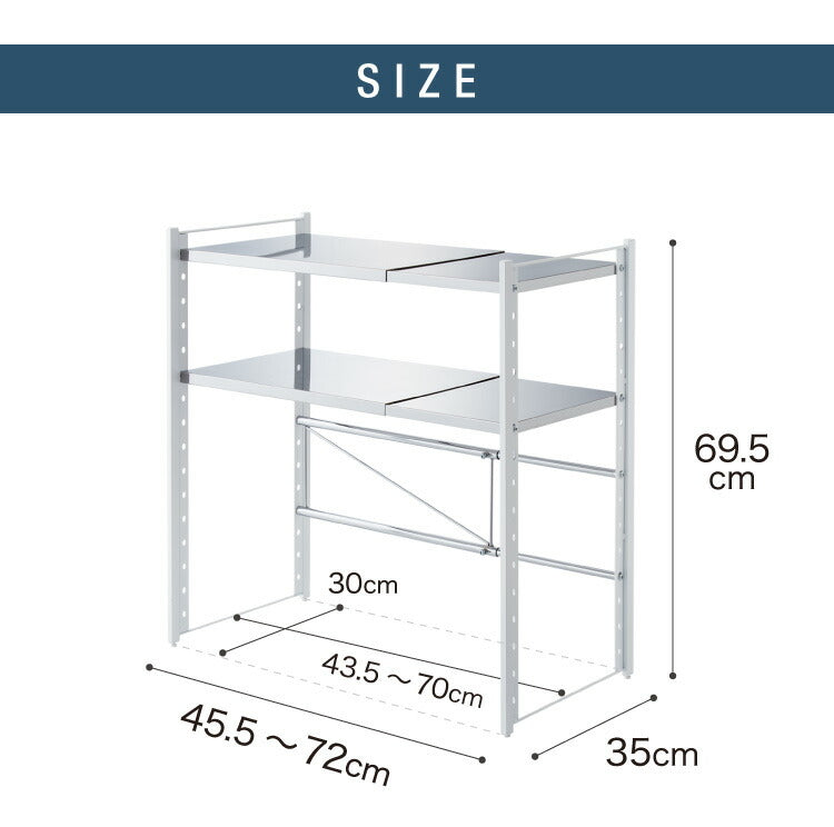 日本製 燕三条 伸縮レンジ上ラック 2段 ステンレス棚 キッチン家電をまとめて収納! 幅45.5~72 高さ調節 キッチンラック レンジ上 伸縮 棚 電子レンジ 家電上ラック カウンター上収納 頑丈 おしゃれ(代引不可)