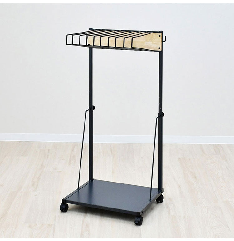 無垢材を使用したハンガー掛け受け部は、ナチュラルな雰囲気を醸し出し、インテリアとしても魅力的です。シューズを置ける棚や、キャップやリュックサックを掛けられるフックも付いており、収納スペースを有効活用できます