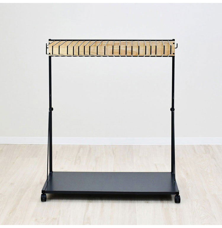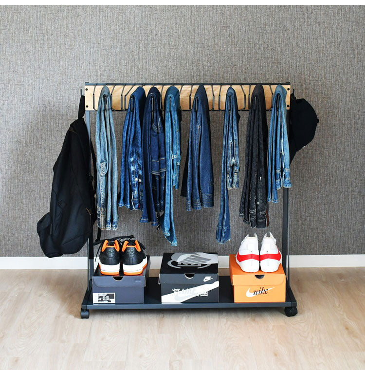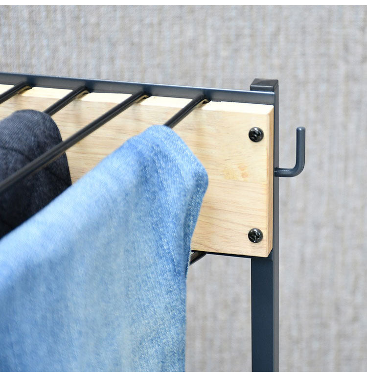 無垢材を使用したハンガー掛け受け部は、ナチュラルな雰囲気を醸し出し、インテリアとしても魅力的です。シューズを置ける棚や、キャップやリュックサックを掛けられるフックも付いており、収納スペースを有効活用できます