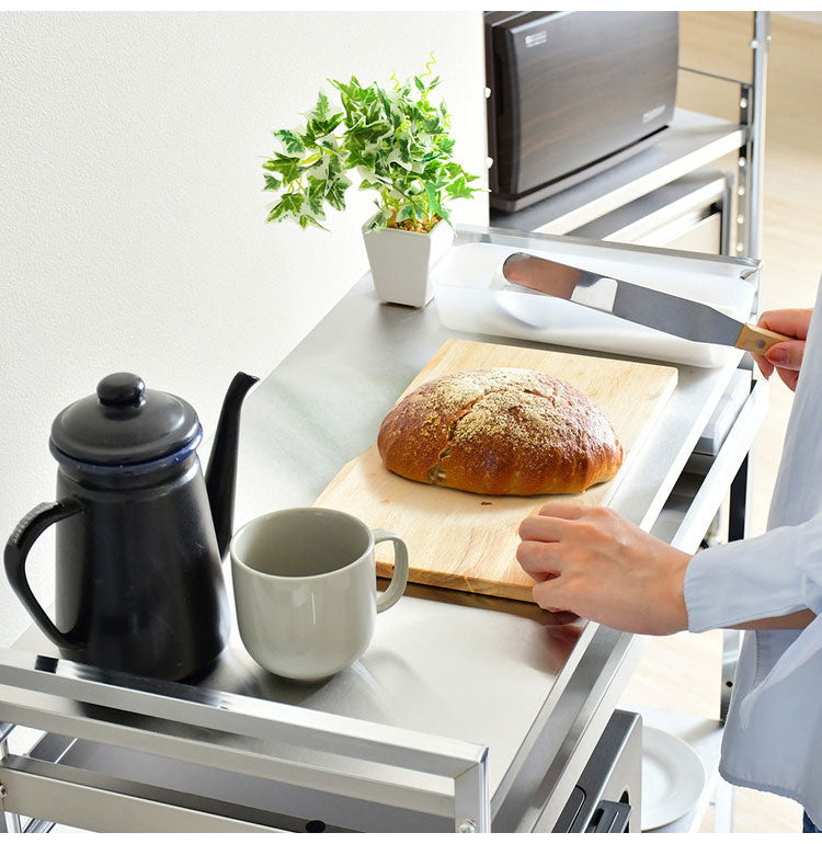また、引き出しと複数の棚が付いているため、調理器具や食材、その他のキッチン用品を整理整頓して収納することができます。