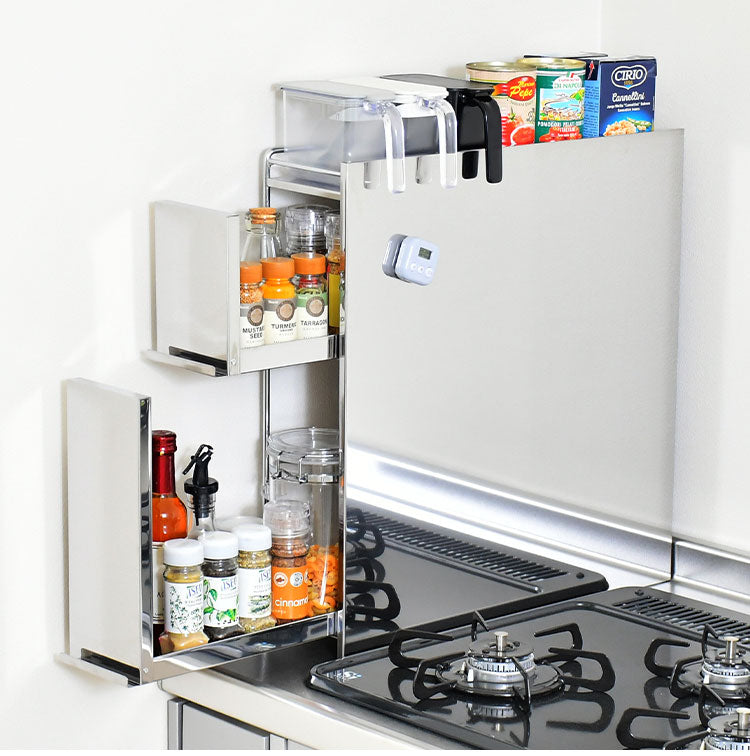 日本製、燕三条製、国産、ステンレス製、調味料ラック、2段、スパイスラック、引き出し、引出し、収納、ドロワー、マーナ、調味料ポット、コンロ横ラック、コンロサイドラック、油跳ねカバー、油跳ねガード、油はねカバー、油跳ねガード