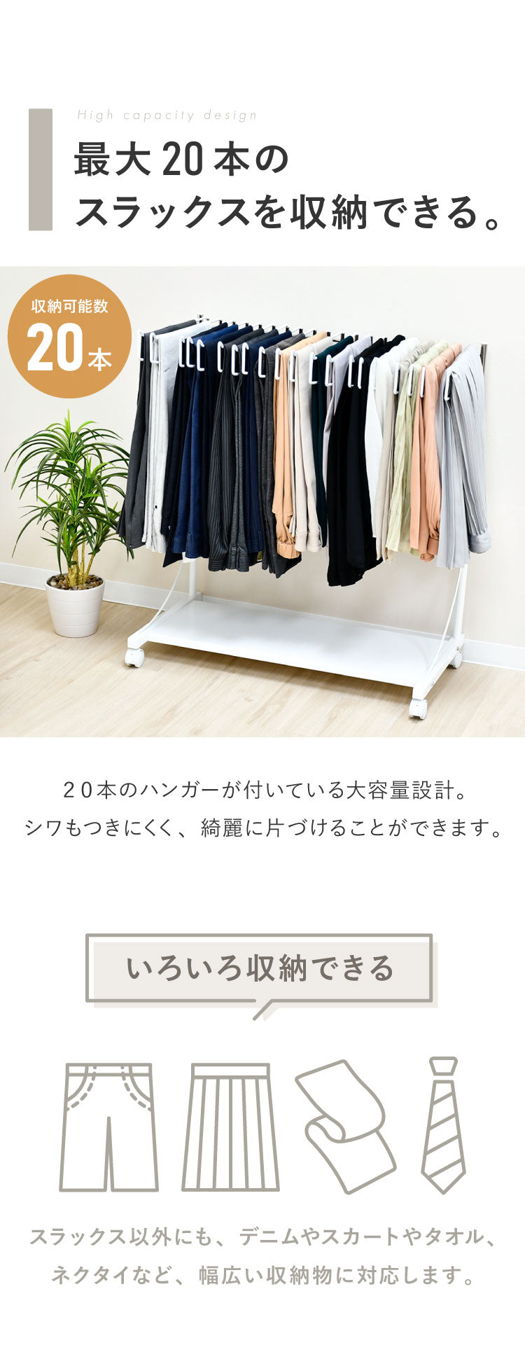 スラックスもカバンもひとまとめに収納できるハンガーです。