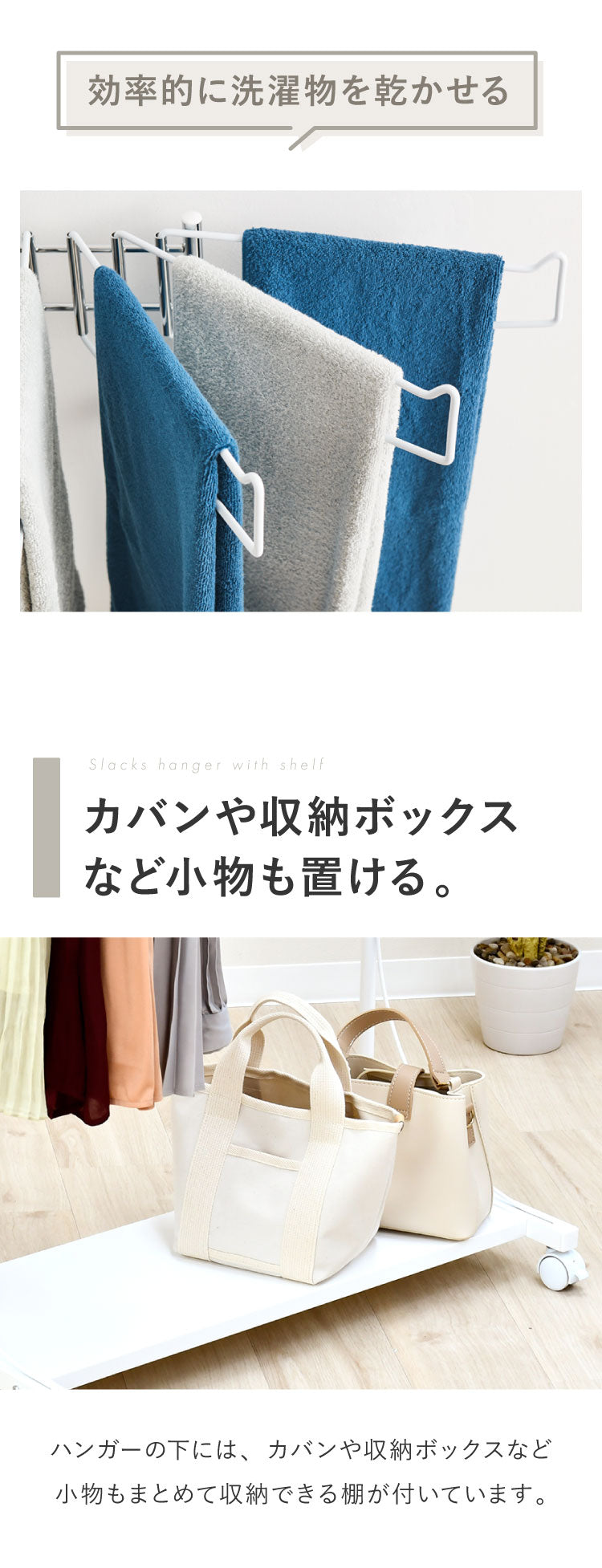 スラックスだけでなく、タオルハンガーとしても使えます。