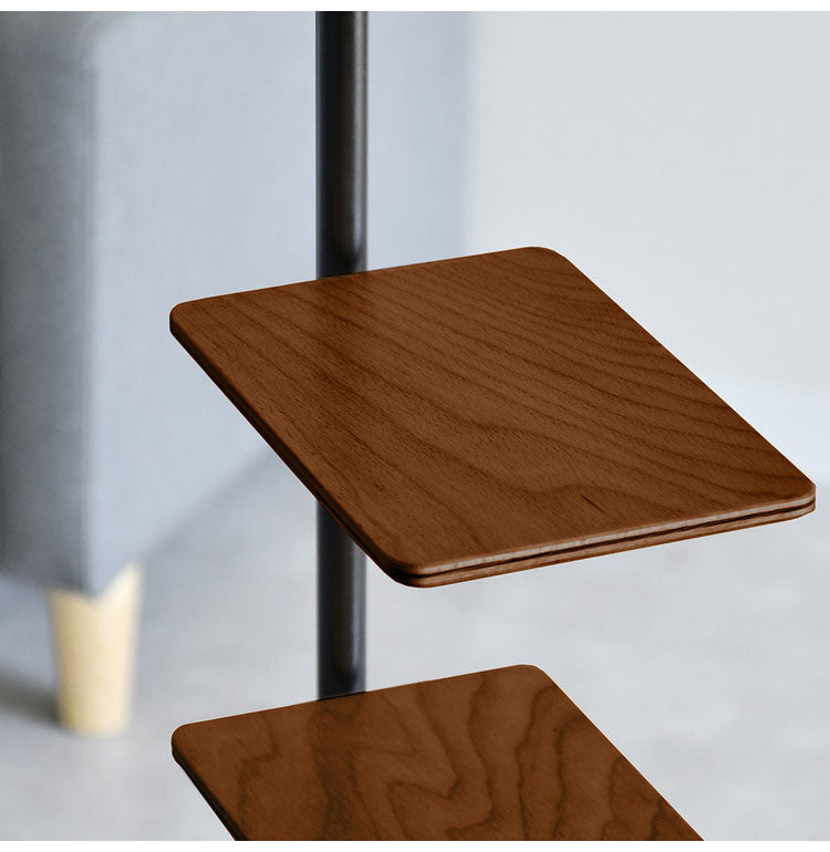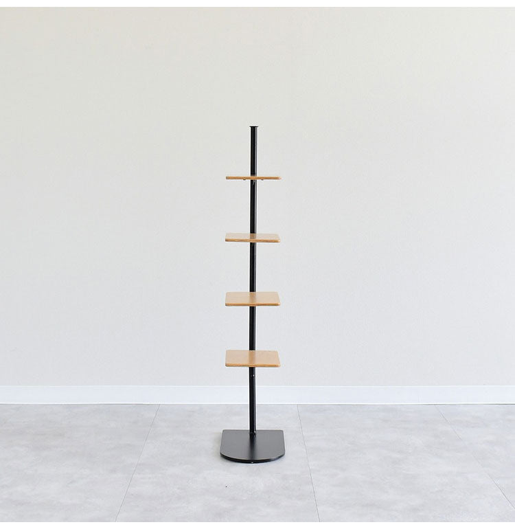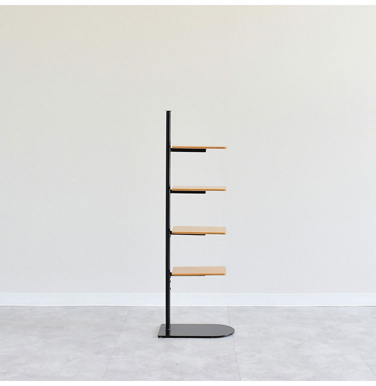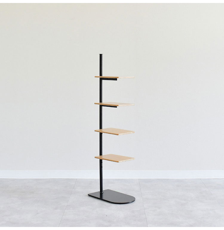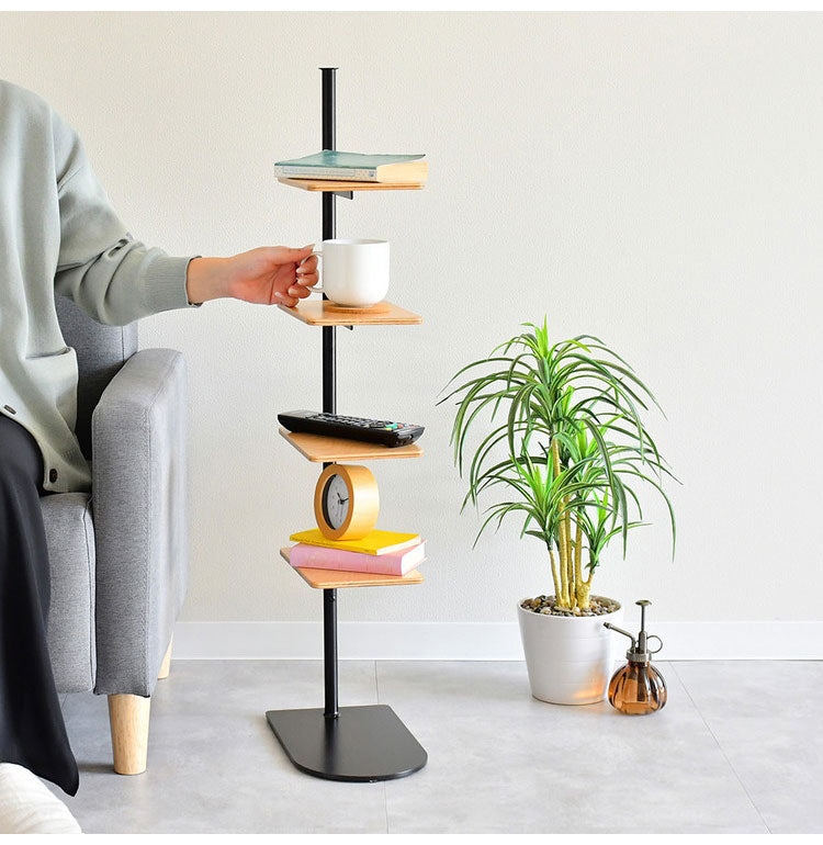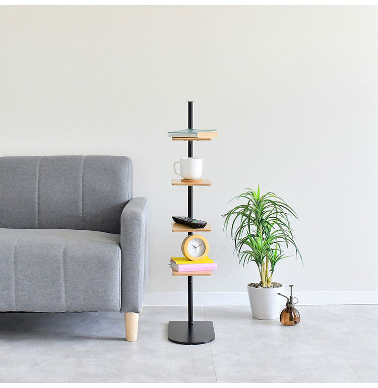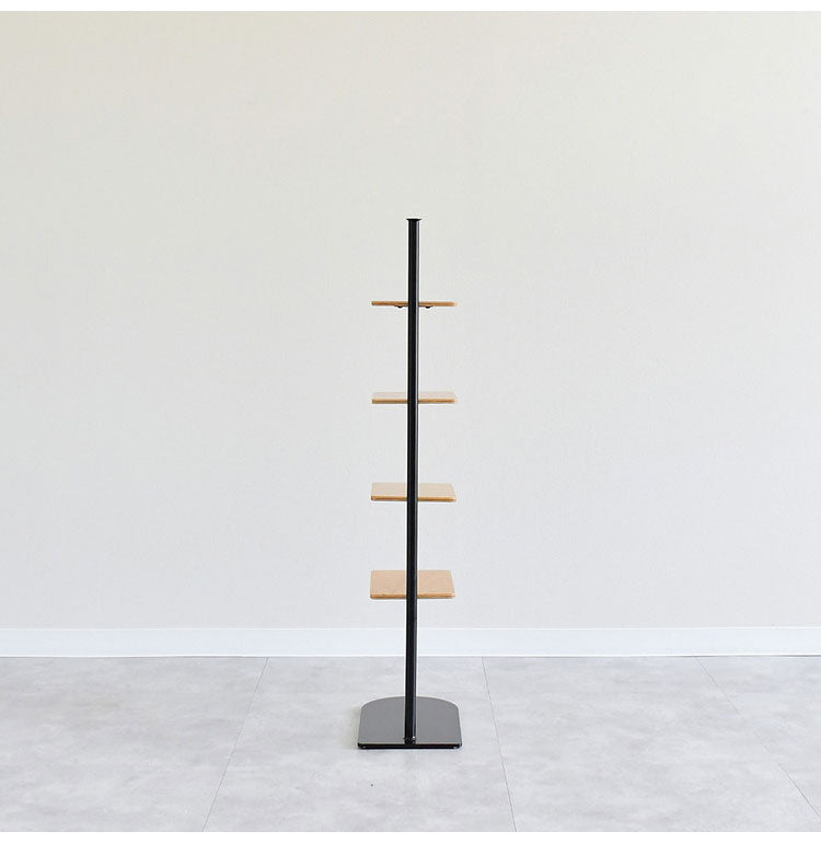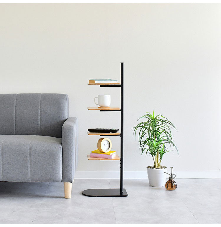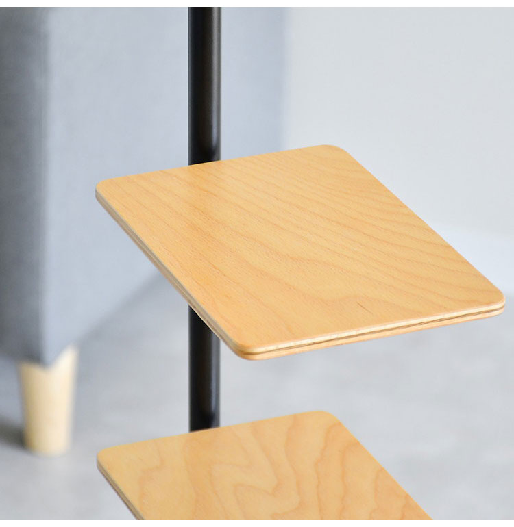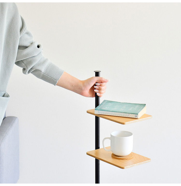 新潟県南魚沼産木材を棚板に使用したスタンドシリーズ。積層合板は強度面に優れているため、厚みを最大限まで抑えシンプルで軽快なフォルムに。一見するとまるで木棚板が浮いているような不思議な感覚を味わえます。ソファやベッド横に配置すれば、読みかけの本やスマホ、リモコンなど多様なアイテムの置き場として活躍します。