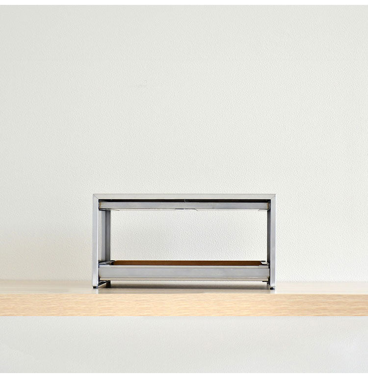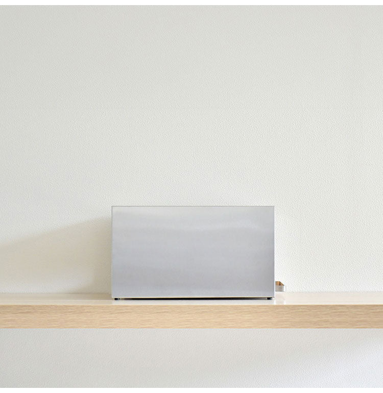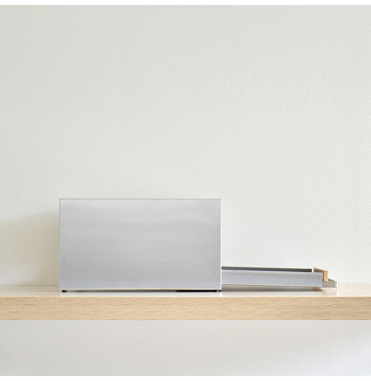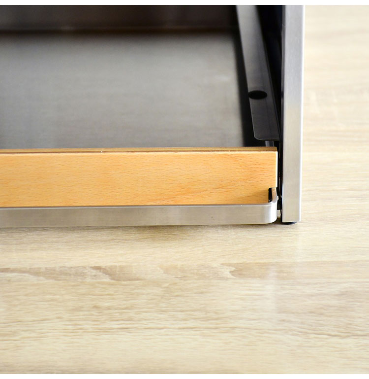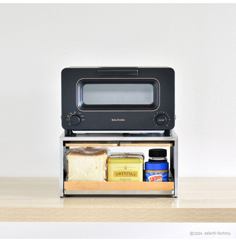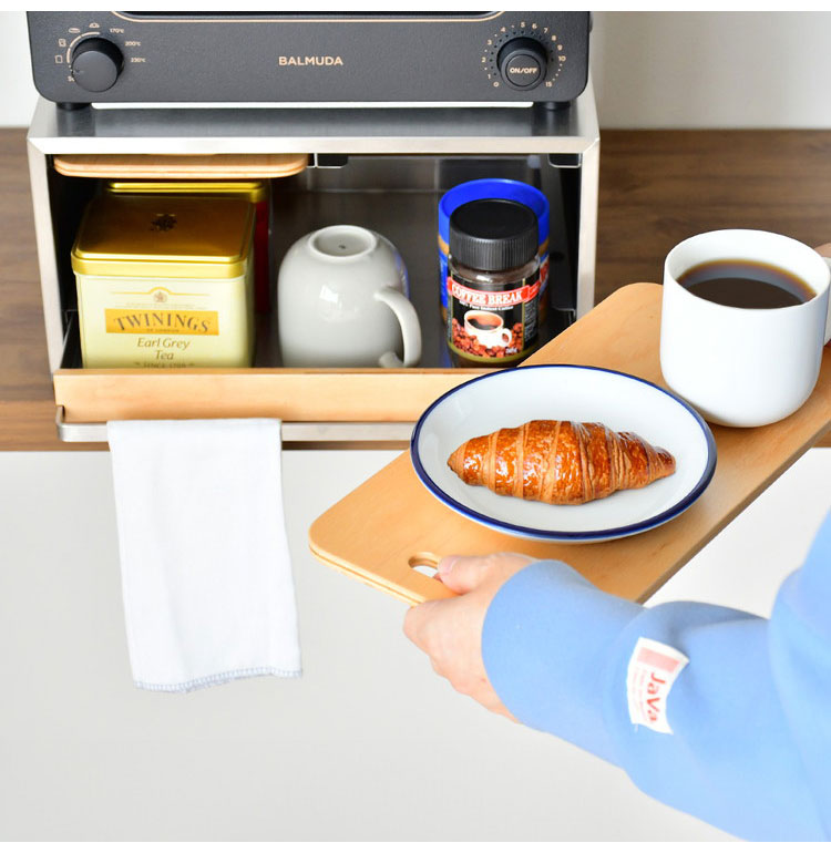 こだわりのマテリアルは、デザイン家電やご自慢のキッチンボードとの相性も抜群です。 オープン収納部にはトースターと相性の良い食材などを保管。引き出し付きだから奥の物を取り出すのもスムーズです。収納庫内上部には、2枚のサービングトレイが付いており、家電調理したものをそのままサービングできます。