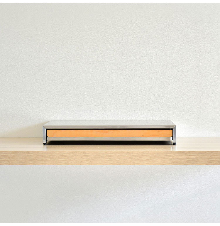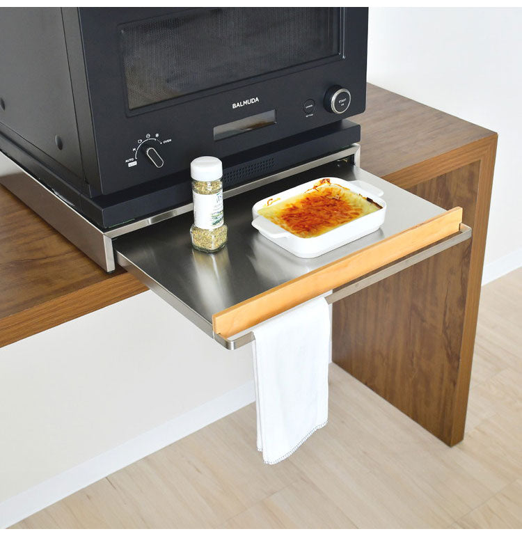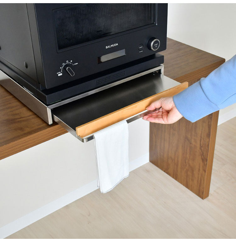 サビに強くお手入れのしやすいステンレスに、南魚沼産木材をポイントに使ったキッチン収納シリーズ。 こだわりのマテリアルは、デザイン家電やご自慢のキッチンボードとの相性も抜群です。 ステンレス取っ手を引くと、ちょい置きに便利なスライドテーブル。取っ手には置き場所に困る布巾も掛けれます。 キッチンボードの収納場所の有効活用に最適です。