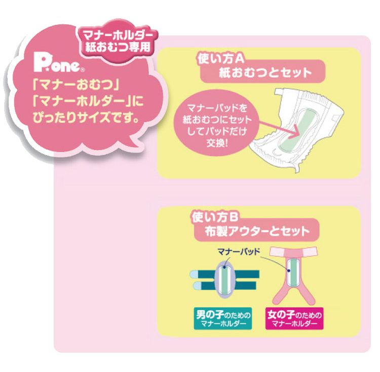 「マナーホルダーActive」や「マナーおむつ のび〜るテープ付」等、様々なアウターにお使い頂けます。