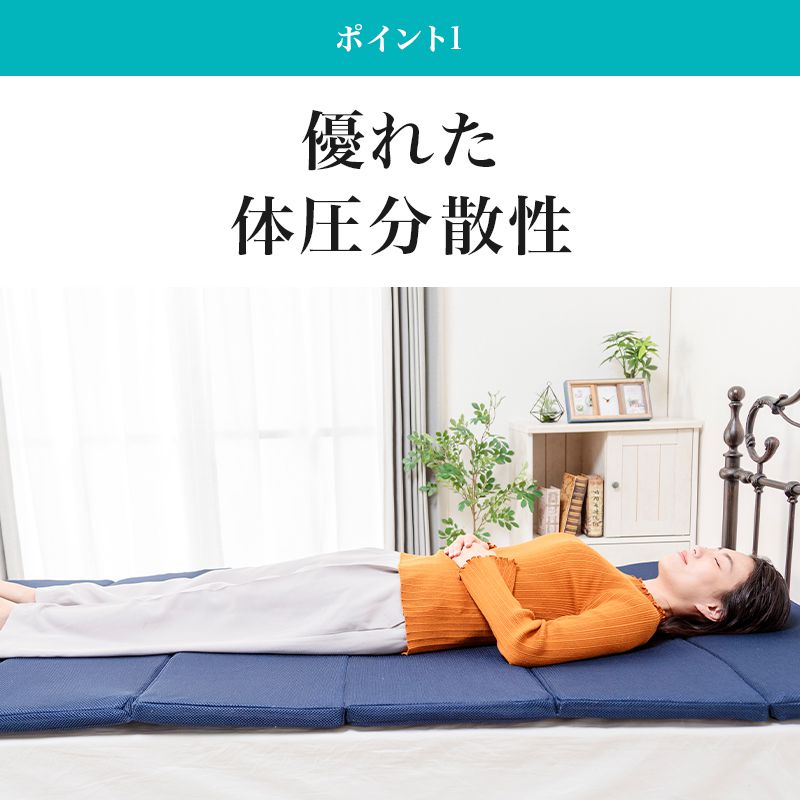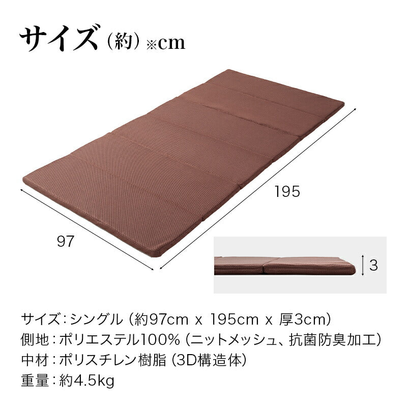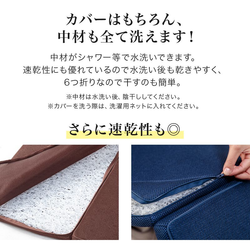 硬め、高反発、カバー、折りたたみ、六つ折り、汗、あせ、ムレ、湿気、ラク、ソファ、車内、車中泊、屋外、アウトドア、キャンプ、ブラウン、ネイビー、アイボリー、メッシュ、立体、3D構造体、97×195cm