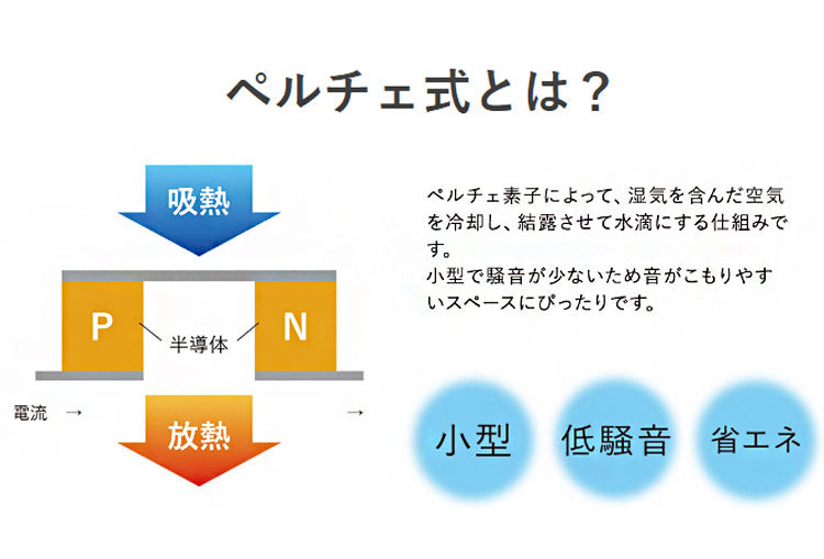 除湿種類は「ペルチェ式」、小型で騒音・振動が少ない低騒音設計
