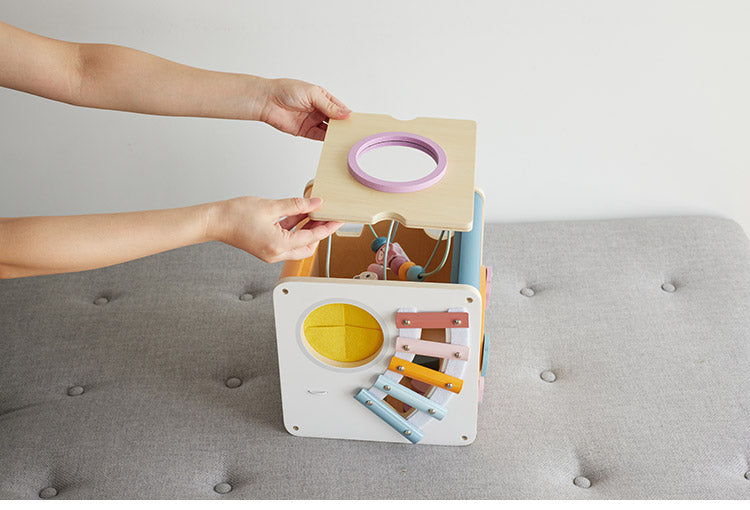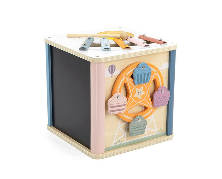 鉄琴、くるくる回る観覧車、ビーズコースター、黒板、鏡、型はめなど8つの遊び方が楽しめます。