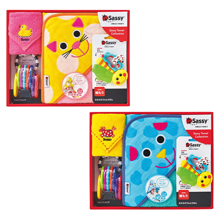 Sassy サッシー 出産祝いおくるみセット 出産祝い おくるみ フード付きバスタオル ミニタオル 歯固め リング 4点セット タオル バスタオル 子ども用タオル ギフト