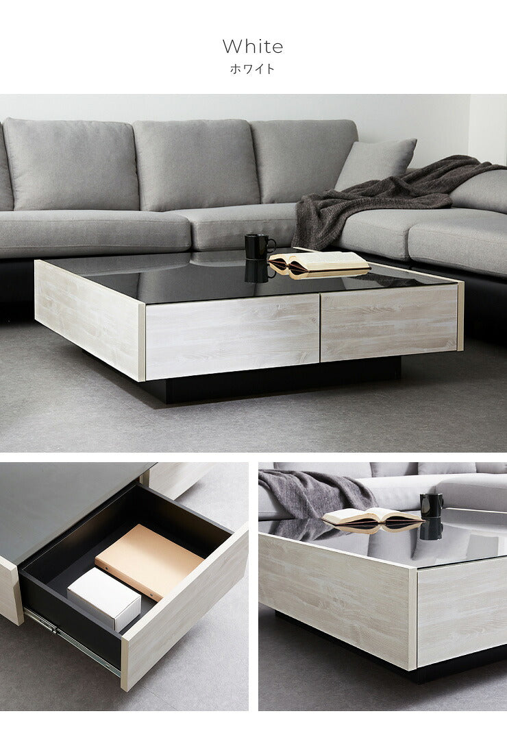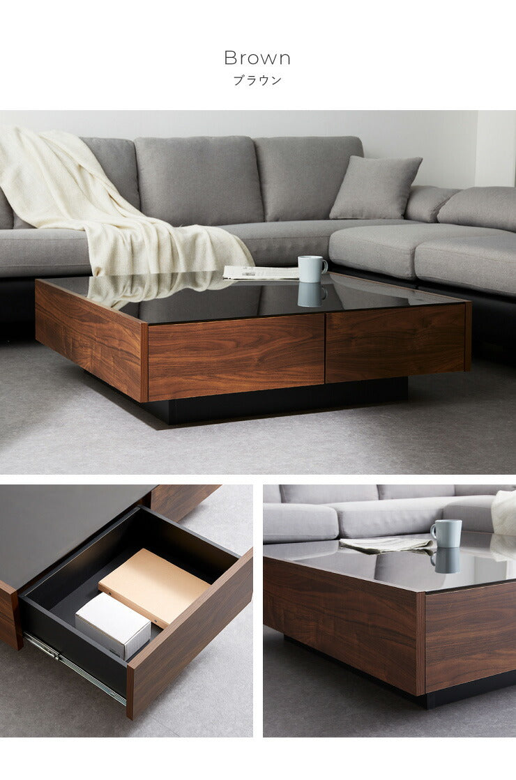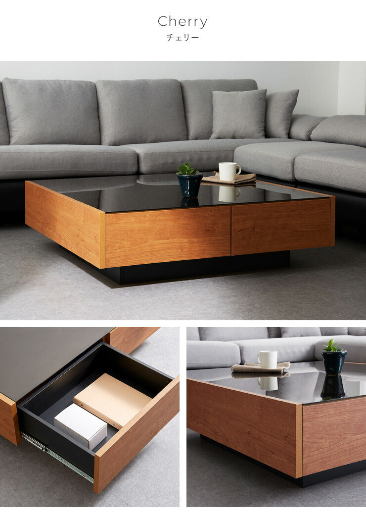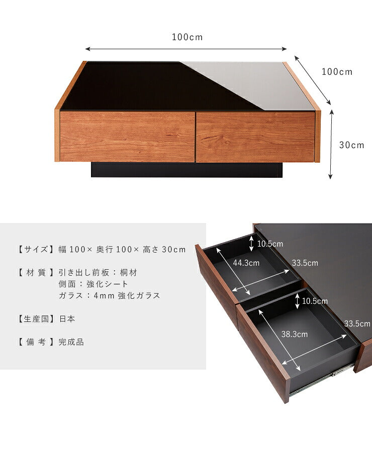 センターテーブル 日本製 桐材使用 木製 100×100cm 正方形 ガラス天板 引出し おしゃれ シンプル 国産 完成品 大川家具 ローテーブル テーブル 収納 ブラックガラス (代引不可)