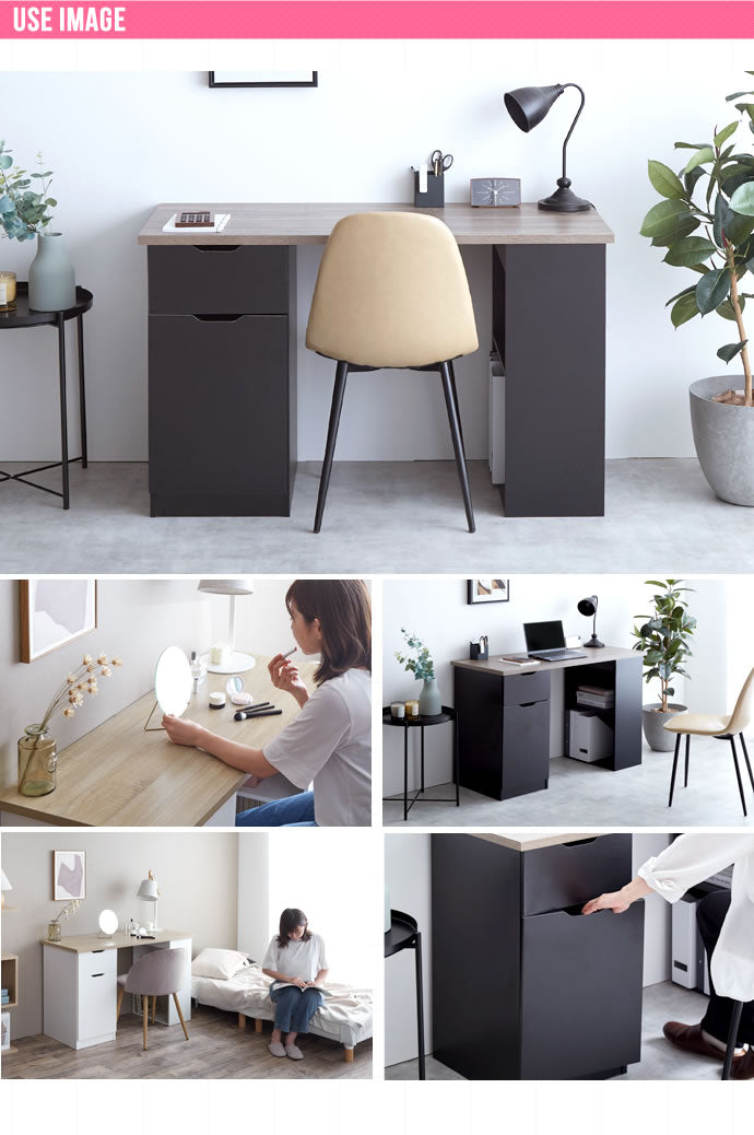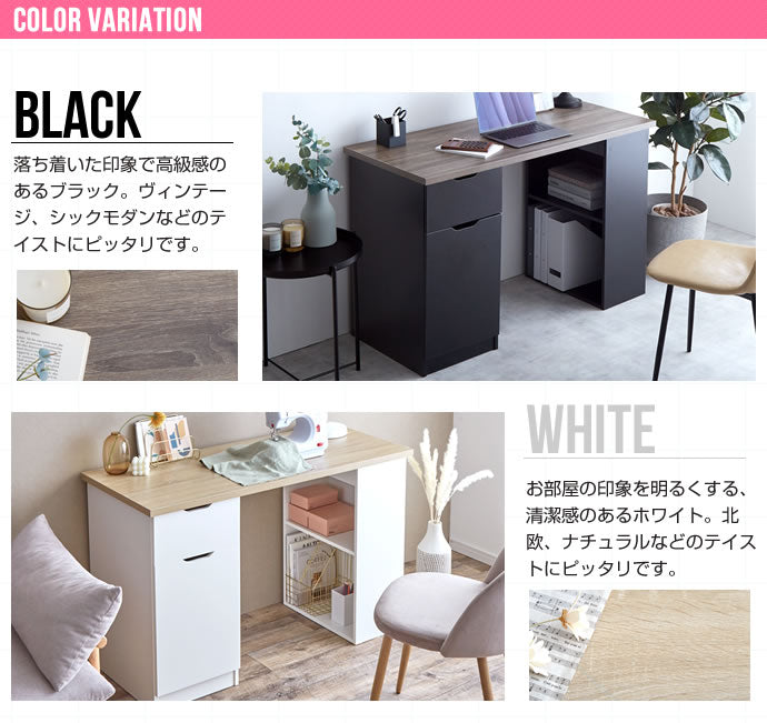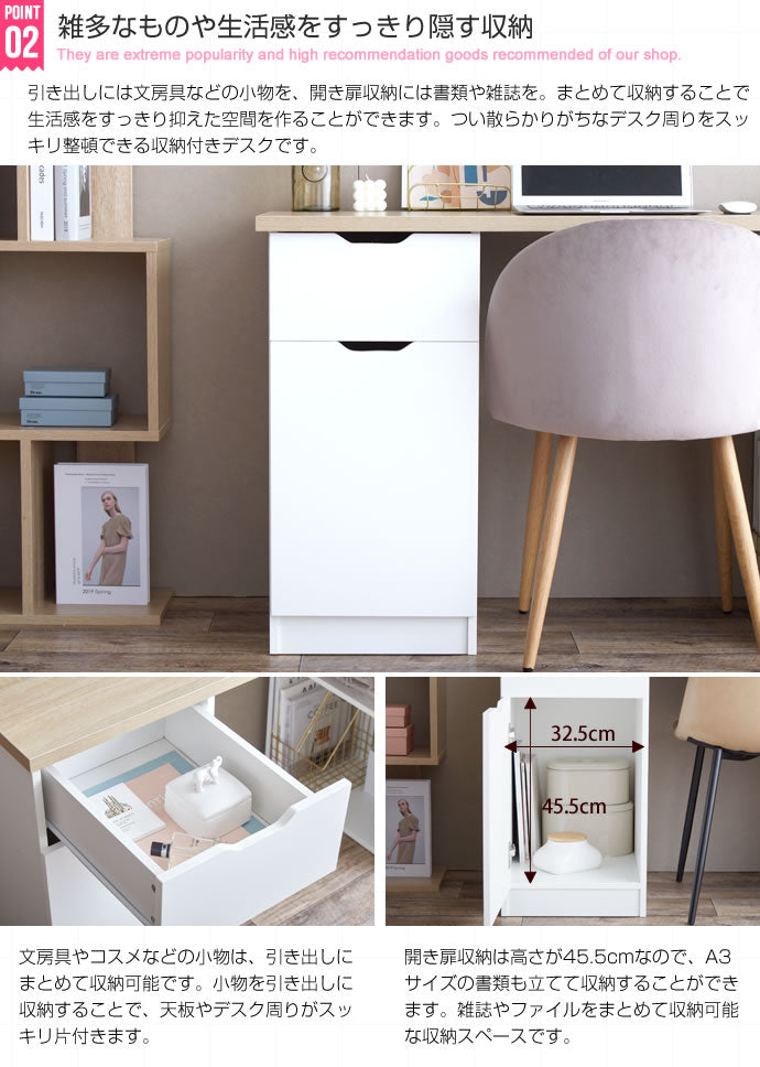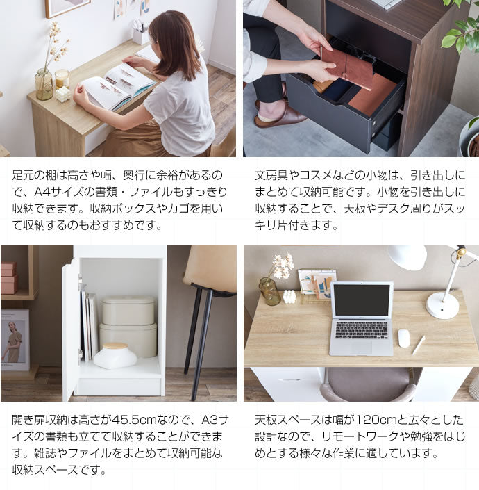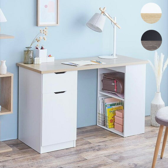 引き出し・開き扉収納・棚の3種類の収納スペースを備えた、実用性の高い収納付きデスク