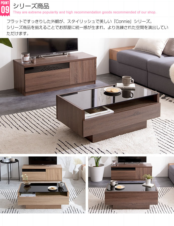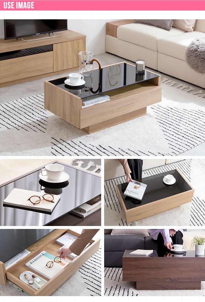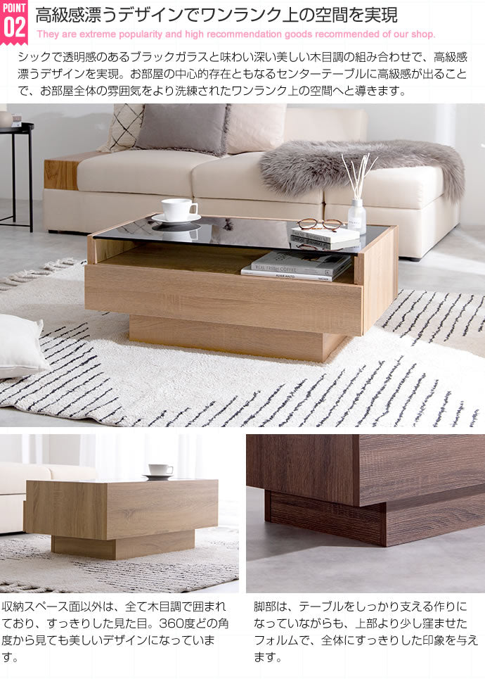 シンプルですっきりした見た目と、豊富な収納力を兼ね揃えたガラス天板センターテーブル