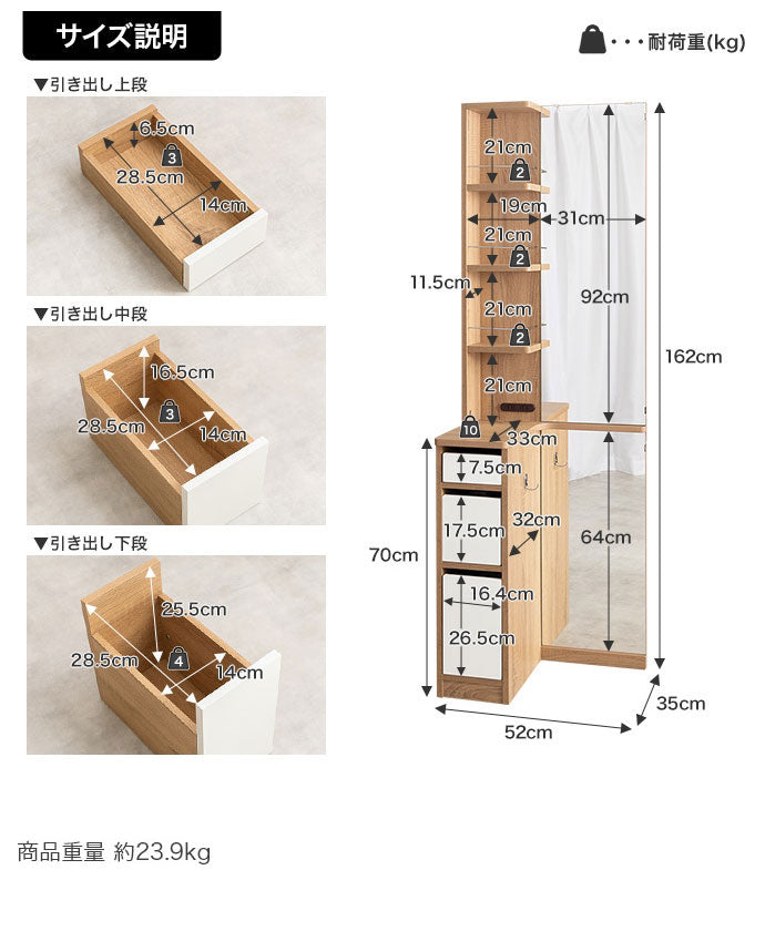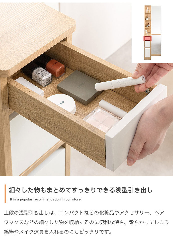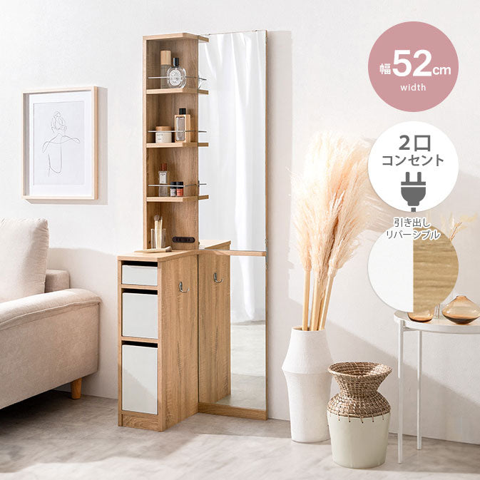 Elena エレナ 収納付姿見ドレッサー 幅52cm 組立品 収納スペース 大鏡 全身映る コンパクト スリム 奥行35cm 高さ162cm 2口コンセント 引き出しリバーシブル 一人暮らし ワンルーム 姿見(代引不可)