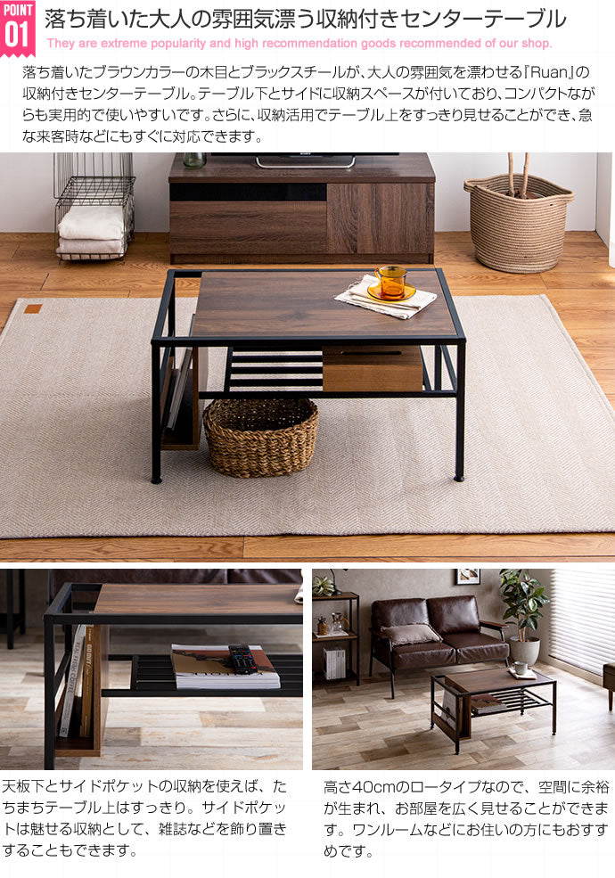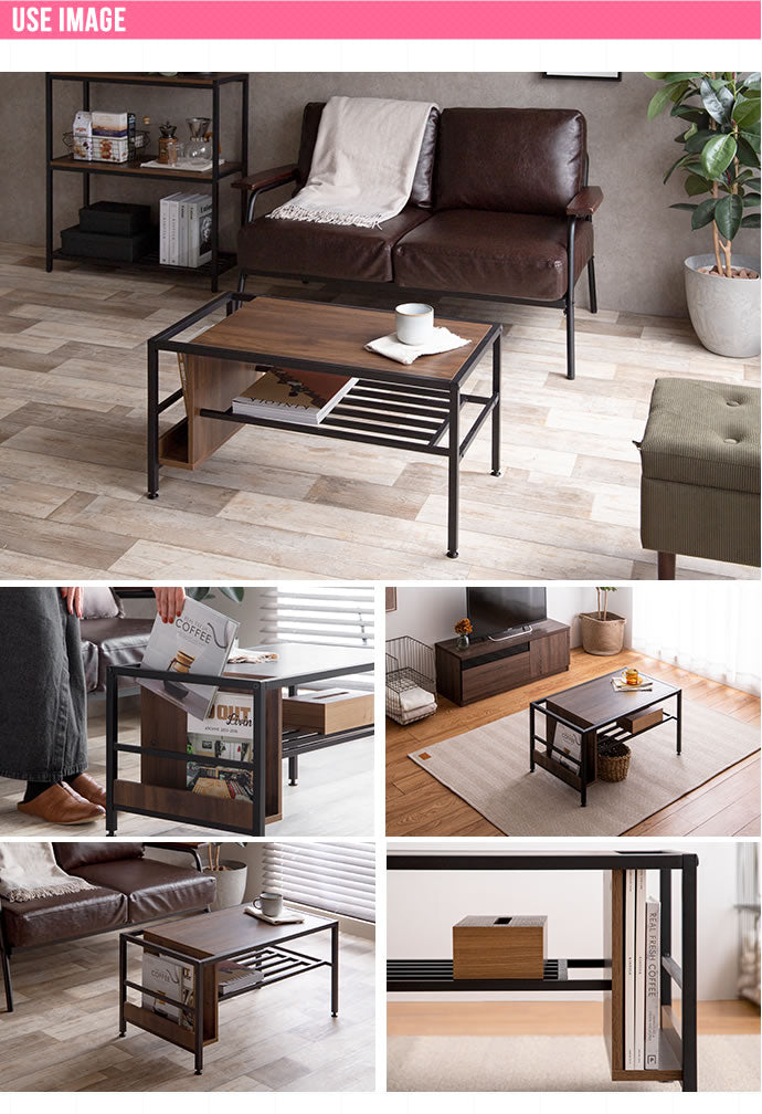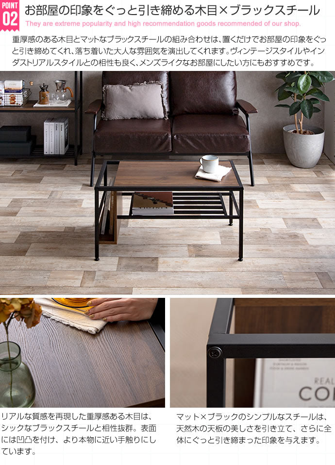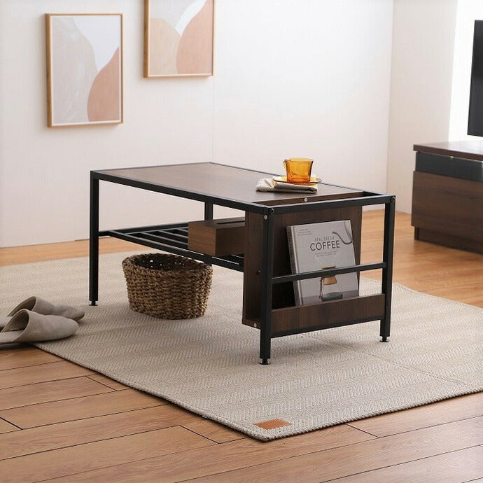 重厚感溢れるブラウンカラーの木目とブラックスチールが、大人の雰囲気を漂わせる収納付きセンターテーブル