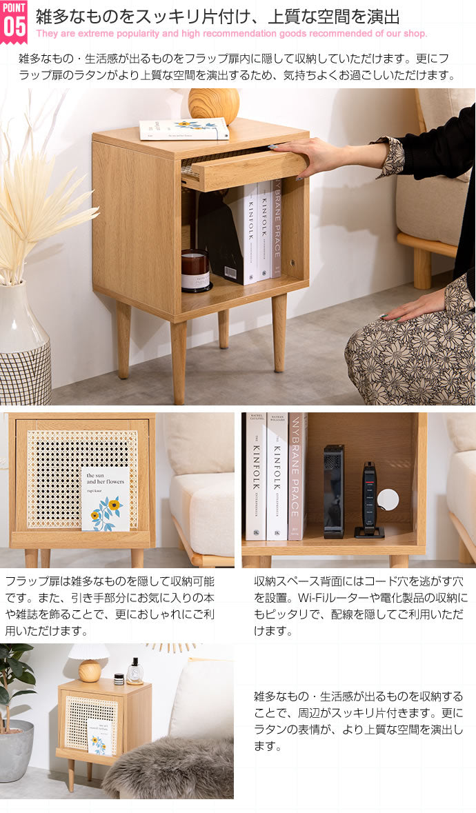 天然ラタンと美しい木目調を使用した、ナチュラルで温かみあるラタンサイドキャビネット