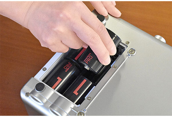 家庭用コンセントに挿入するACアダプタに加えて、単一形乾電池(8本)でも使用できます。