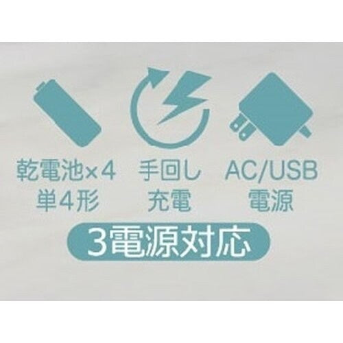 緊急時は手回し充電/ご家庭では付属のAC電源/屋外の使用、外出時では単4乾電池!