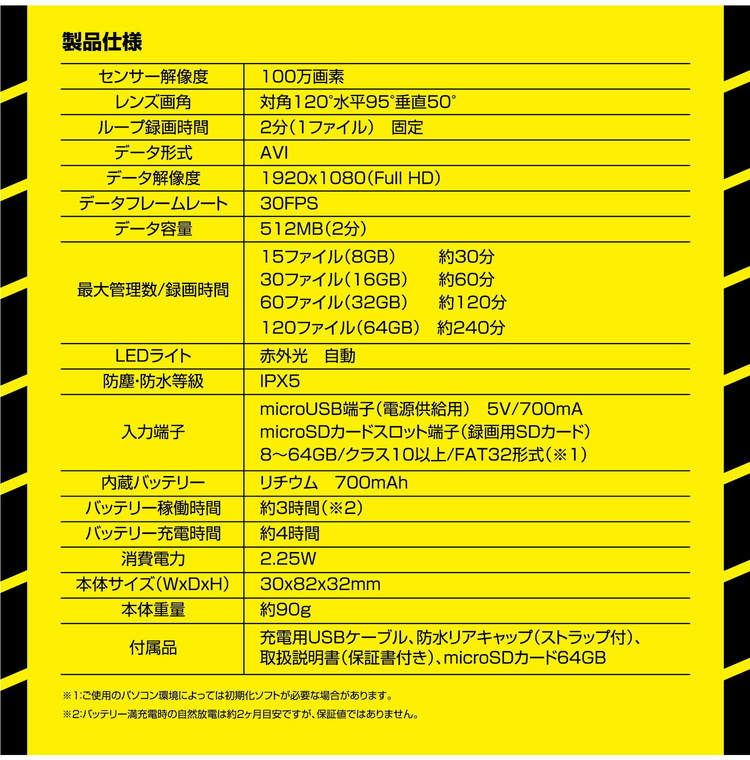 付属品:充電用USBケーブル、防水リアキャップ(ストラップ付)、取扱説明書(保証書付き)、microSDカード64GB